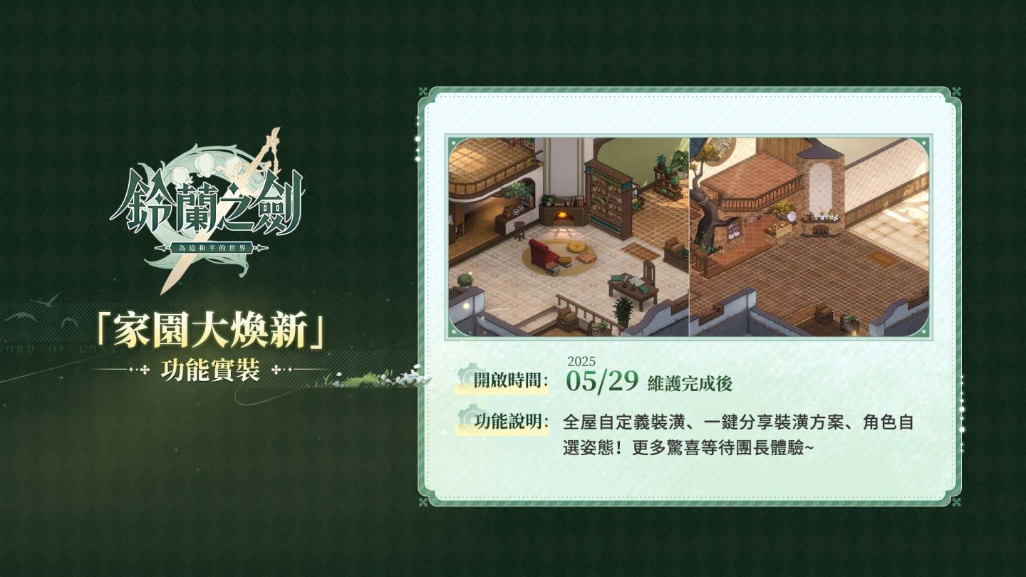 全新功能正式實裝:支援全屋自定義裝潢、一鍵分享裝潢方案,還可自由設定角色在家園中的展示姿態!更多驚喜與細節等待玩家們親自探索,共創專屬於你的溫馨家園。