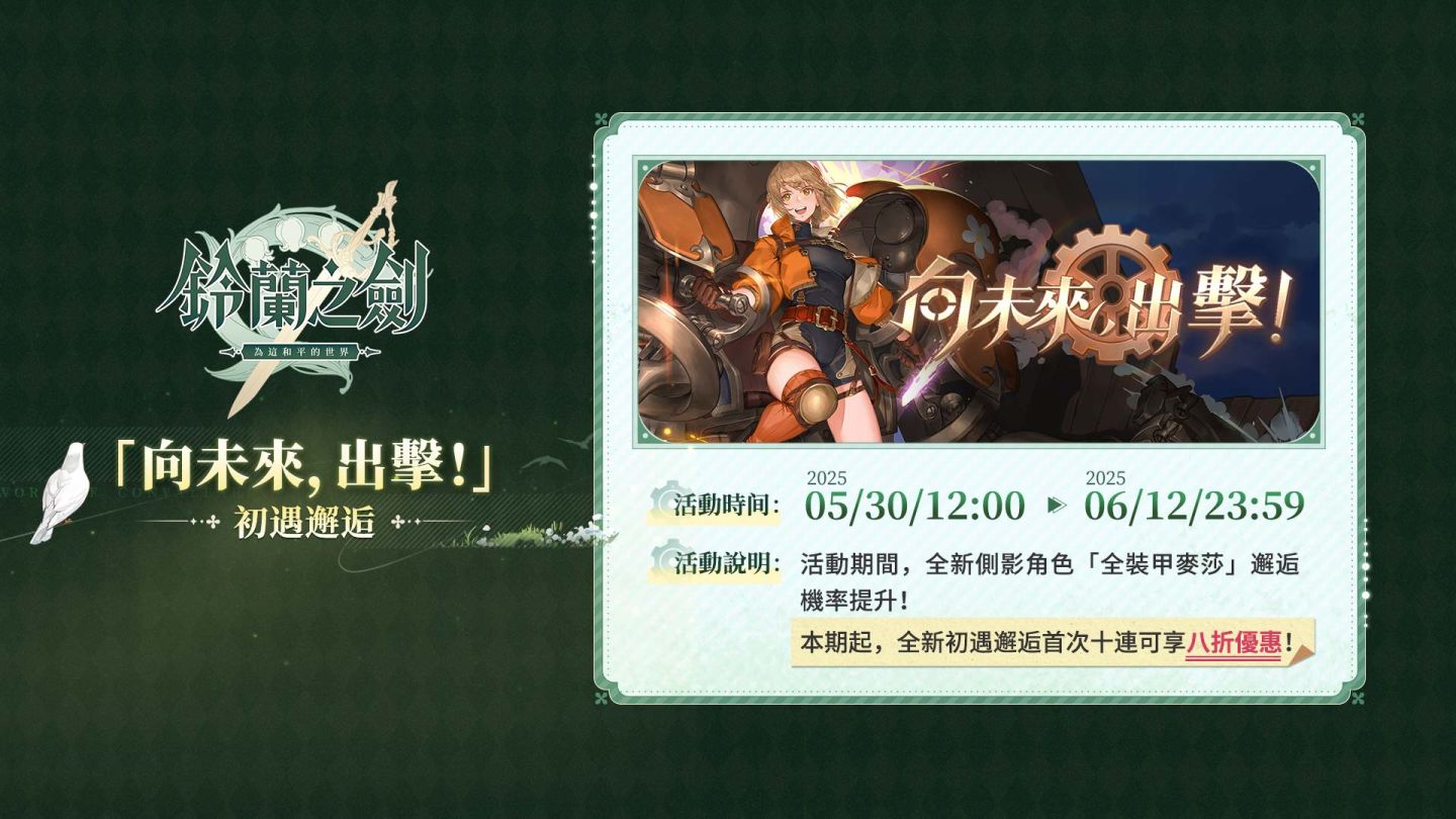 在鈴蘭節之際,《鈴蘭之劍》推出主題活動「於鈴蘭中再會」,邀請所有玩家共慶和平的到來!本次改版內容包含家園系統全新升級、「力量認證」全新玩法震撼登場,茉茉新外觀「甜香爛漫」正式亮相,「時願長隨」簽到活動送出免費十連抽,「復甦的記憶」限時活動與多項豐富活動同步展開!傳說角色「全裝甲麥莎」亦將同步登場,請各位團長敬請期待!