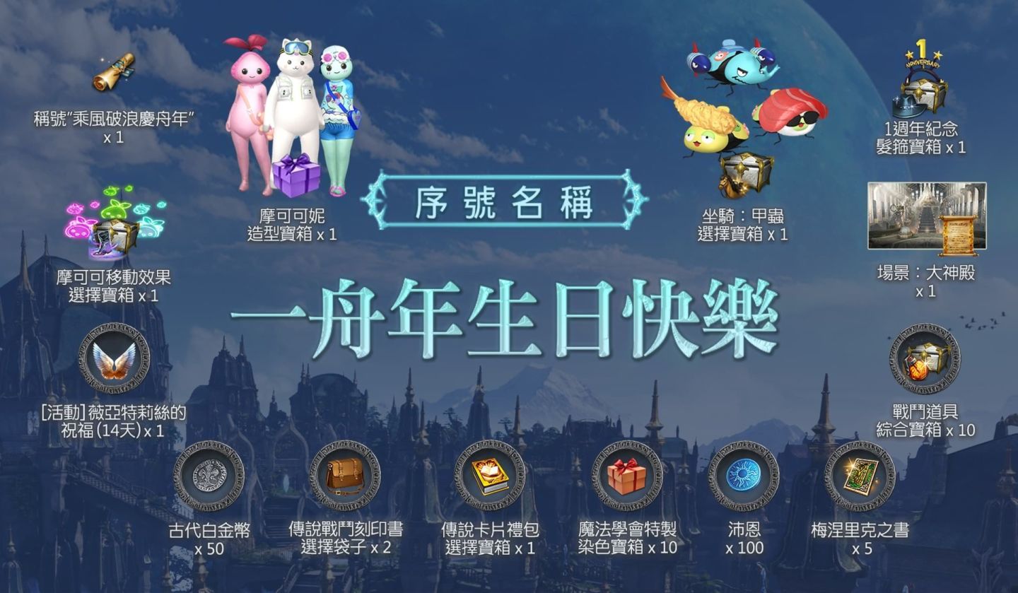 感謝所有冒險家在這一年中的陪伴與支持,官方特別準備週年紀念序號「一舟年生日快樂」,前往官網兌換頁輸入即可獲得豐富好禮。賀禮內容包含實用道具、眾所期待的「摩可可妮造型寶箱」、「摩可可移動效果選擇寶箱」,還有坐騎「甲蟲選擇寶箱」,絕對值得收藏!