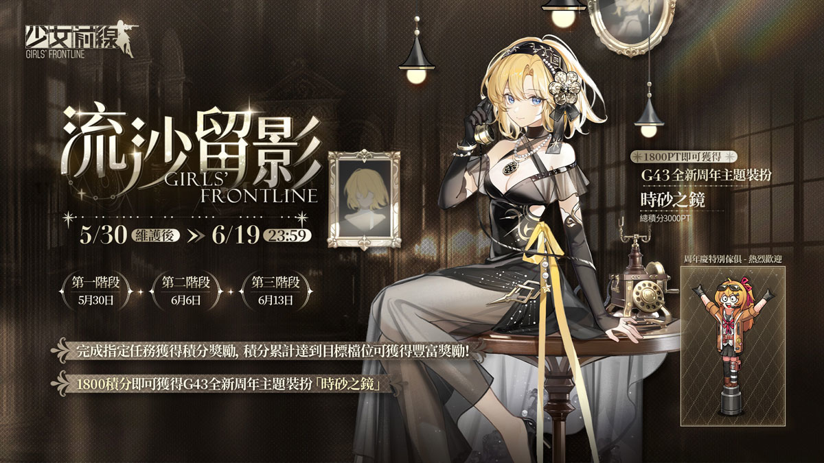 華燈倒映在香檳的瓶身,晚風拂過瓶口,吹響悠揚的豎笛。活動期間完成任務獲取積分,將獲得豐富獎勵,其中包括 9 週年紀念傢俱「熱烈歡迎」以及 G43 週年慶特別主題裝扮「時砂之鏡」!我們在此刻舉起酒杯,慶祝相逢。