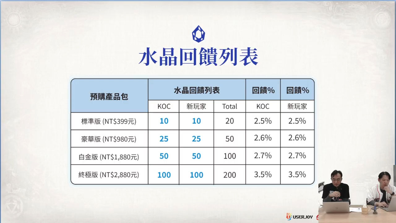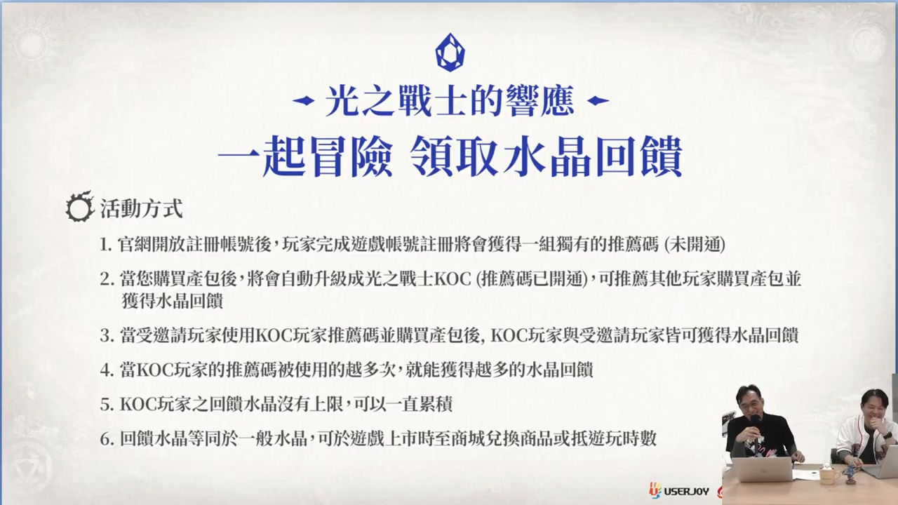 為促進社群互動並比照國際版等,玩家於官網完成帳號註冊後可獲得一組專屬推薦碼,購買產包後即可升級為「光之戰士KOC」並啟用推薦碼。KOC 玩家成功推薦其他玩家購買產包後,雙方均可獲得水晶回饋。KOC 玩家推薦成功的次數越多,獲得的水晶回饋也越多,此回饋水晶的累積沒有上限,並可在遊戲正式上市後於商城兌換商品或折抵遊玩時數。
