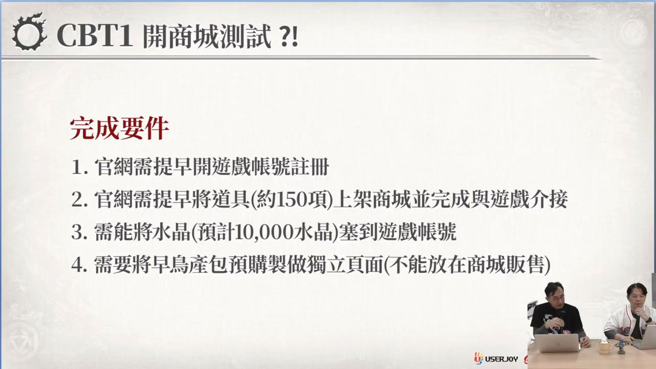 玩家最關心的的首次封閉測試(CBT1)將於 6 月 25 日開啟,並回應玩家期待,測試總人數從原計劃的 3000 名擴增至 5000 名。其中3000 名額將開放給所有玩家自由報名,另有 2000 名額保障給已購買早鳥優惠包的玩家。CBT1 線上報名預計於 6 月 13日 開始,20 日公布中選名單且同步開通測試資格與主程式下載。伺服器將於 25 日上午 11 時開放,官方網站預計同步上線開放帳號註冊與早鳥優惠產包預購。