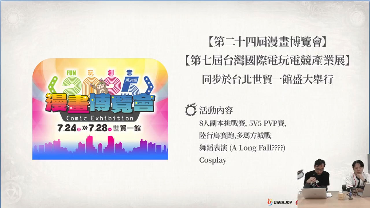 營運團隊預告首次線下電玩展規劃,將有 8 人副本挑戰賽、5V5 PvP對戰賽、陸行鳥賽跑、多瑪方城戰等活動外,詳細內容仍在積極規劃中。至於《FFXIV》製作人兼總監吉田直樹先生是否會親臨現場,營運團隊透露已正式發出邀請,但由於吉田製作人夏季行程相當繁忙,目前仍在努力協調檔期,期盼能為玩家帶來好消息。