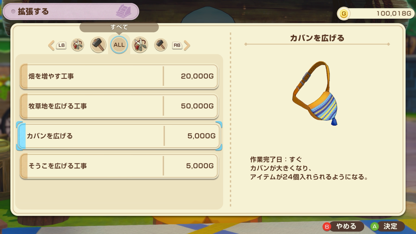 例如開闢新的耕地、建造動物小屋、擴充包包容量等,皆可在工程行的協助下實現。在衝刺營業額的同時,也別忘了活用在市集中獲得的收益,提升牧場經營效率,打造更加優質的商品。