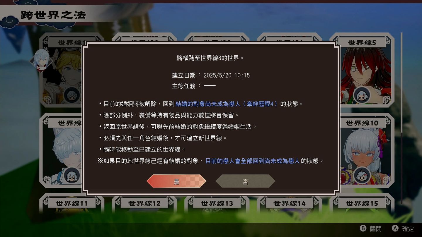 若要在同一個存檔中為所有 16 位角色都建立新的世界線(意味著需要與他們結婚),則在第一個角色結婚後,後續與其他角色結婚並創建世界線大約需要一到兩小時的時間,因此要完成全部 16 個角色至少需要 2 小時乘以 16 個,也就是至少 32 小時的時間。此系統讓玩家在通關主線後,仍能嘗試不同的戀愛路線及後續劇情,極大地豐富了遊戲內容。
