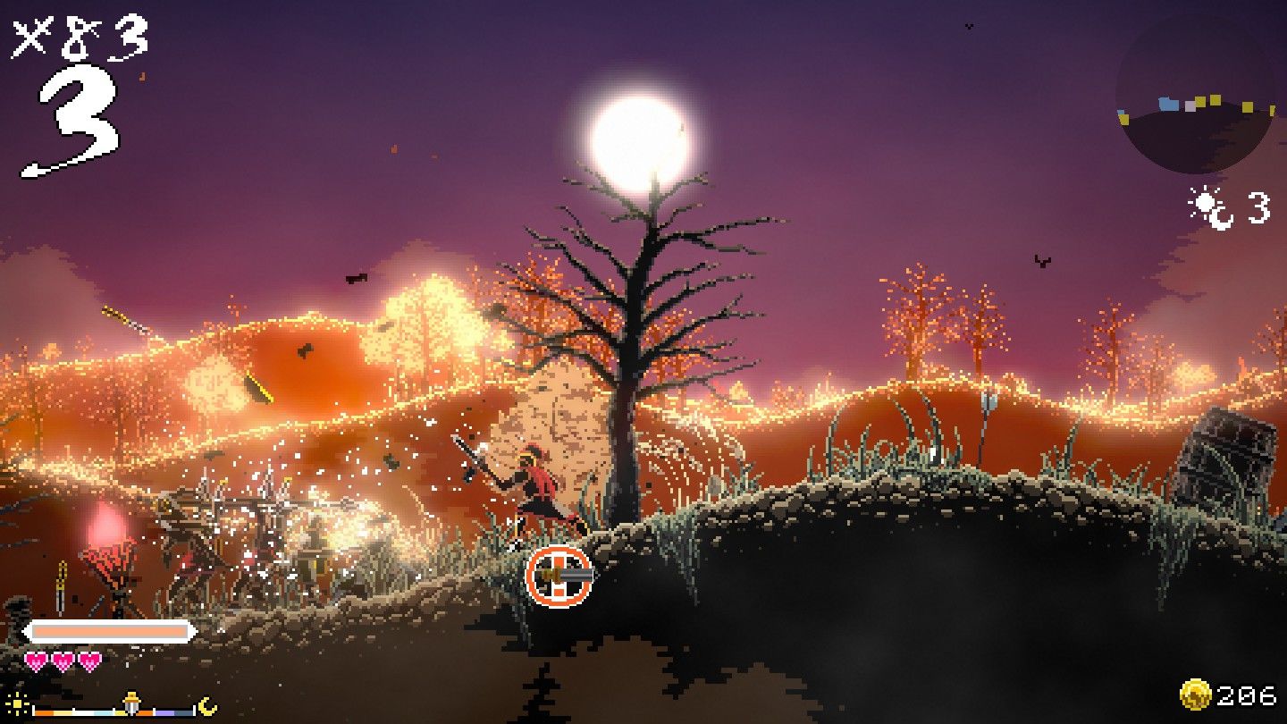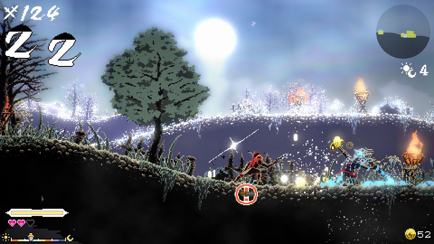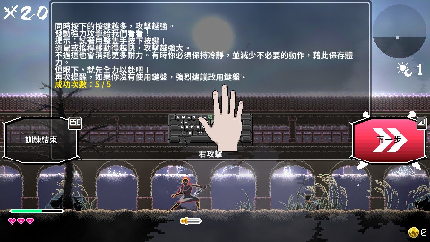 值得一提遊戲的移動方式與攻擊高度相關,玩家在戰鬥中需要更專注於攻擊節奏與按鍵輸入,玩家在冒險過程中,可以向路邊的商人購買物品,透過訓練學習新技能,甚至透過晃動滑鼠來釋放特殊招式,如果你擔心敲鍵盤太大聲,或者是不想毀了寶貴的鍵盤,遊戲依然準備了控制器操作的方案,每當白天血戰生存到夜晚降臨,商人就會降臨讓你買一些很酷的東西,讓你面對第二天的挑戰。