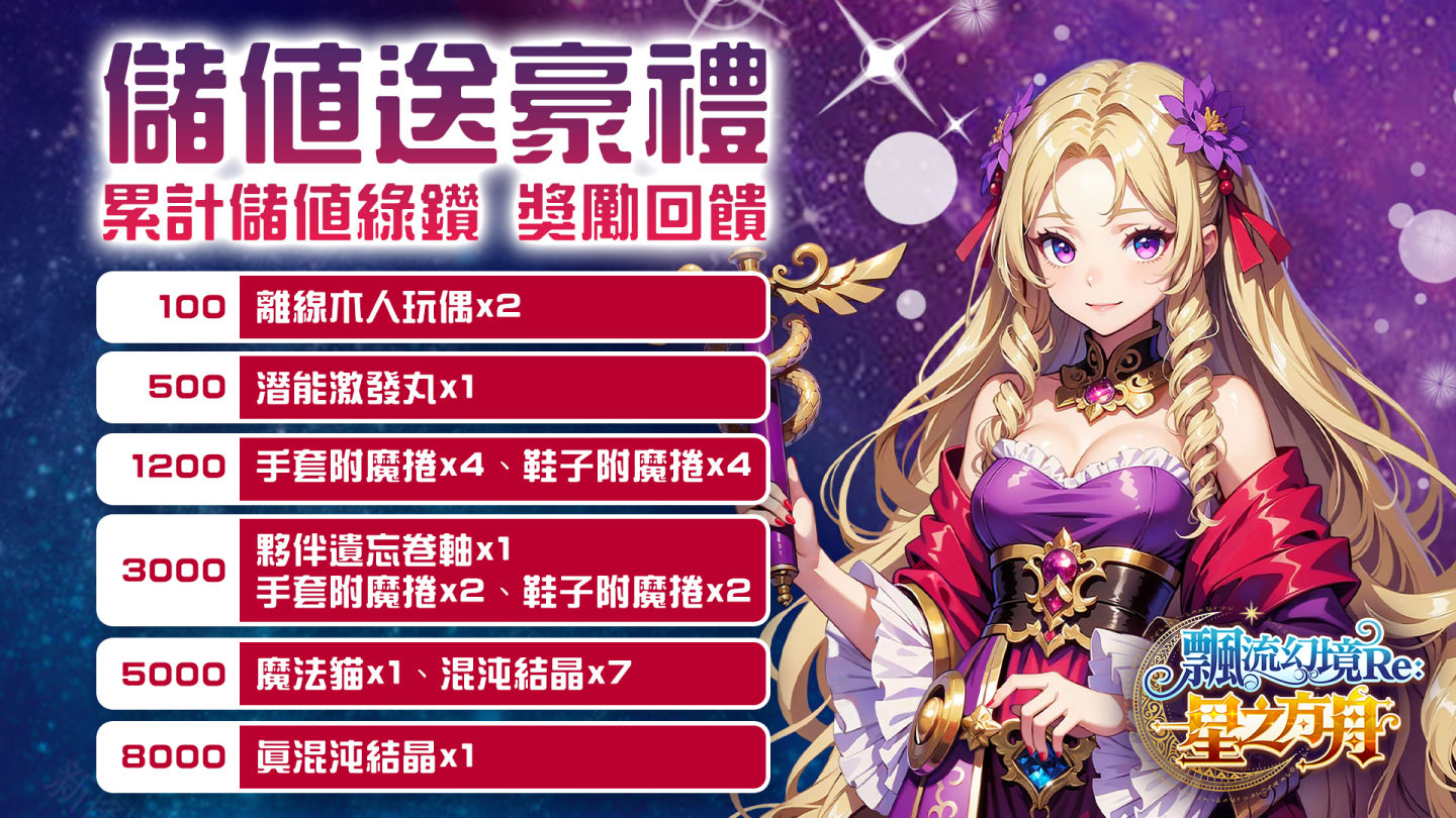 6/3(二)開服後~6/12(四)維護前,期間內累計儲值「綠鑽」達指定數量,即可獲得「真混沌結晶」、「魔法貓」、「混沌結晶」、「夥伴遺忘卷軸」、「手套附魔卷」、「鞋子附魔卷」等豪華虛寶道具。機會難得,千萬不要錯過!