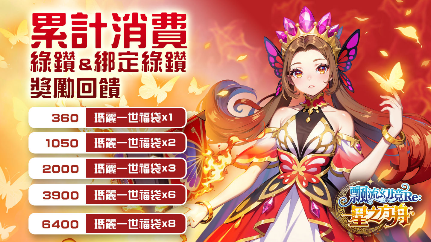 6/3(二)開服後~6/12(四)維護前,期間內累計消費「綠鑽」或「綁定綠鑽」達指定數量,即可獲得「瑪麗一世福袋」。開啟後有機會獲得「瑪麗一世選擇券」、「熾熱玫瑰」、「夥伴遺忘卷軸」、「3 倍經驗聖水」等各式超值虛寶道具。