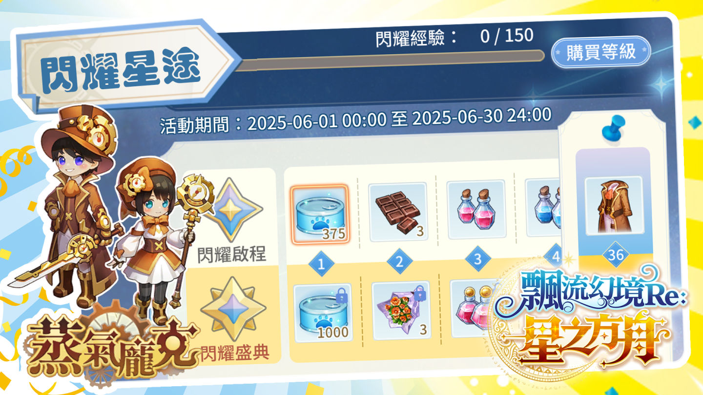 6/3(二)開服後~6/30(一)23:59 止,凡玩家角色等級達到 19 級,期間內開啟活動介面將可查看每日與每週任務,達成活動指定任務後即可獲得閃耀經驗,隨著經驗累積、提升閃耀等級,「閃耀星途」中的獎勵將一一解鎖!包含上衣裝備「蒸氣龐克上衣」與特殊裝備「蒸氣龐克齒輪」作為本次最終大獎,正等待著完成閃耀星途的玩家親自領取!