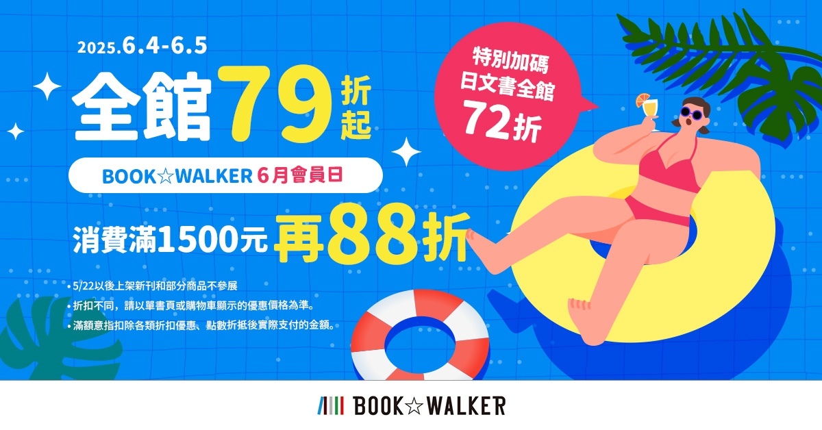最後是讀者們引頸期盼的 6 月 BOOK☆WALKER 會員日優惠活動!6 月 4 日至 6 月 5 日限時兩天,全館 79 折起,消費滿 1,500 元再打 88 折,最低可享 7 折買書優惠!本次更特別加碼日文書全館 72 折。喜歡人氣女星寫真、繪師畫冊、知名作者同人本的你,快快檢查心願清單,將期待的作品通通收藏起來吧!