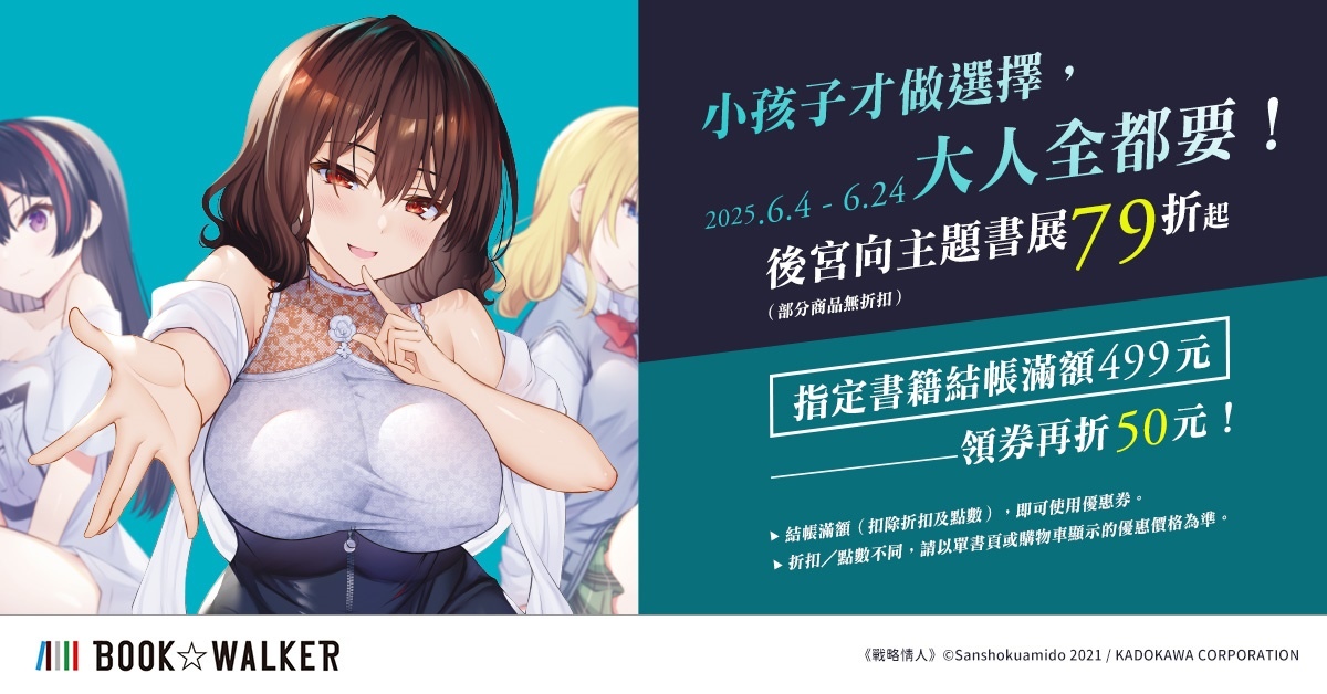 令人熱血沸騰,即將上線的是「小孩子才做選擇,大人全都要!」後宮向主題書展!6 月 4 日起至 6 月 24 日,活動期間優惠 79 折起,指定書籍滿 499 元領券再折 50 元!