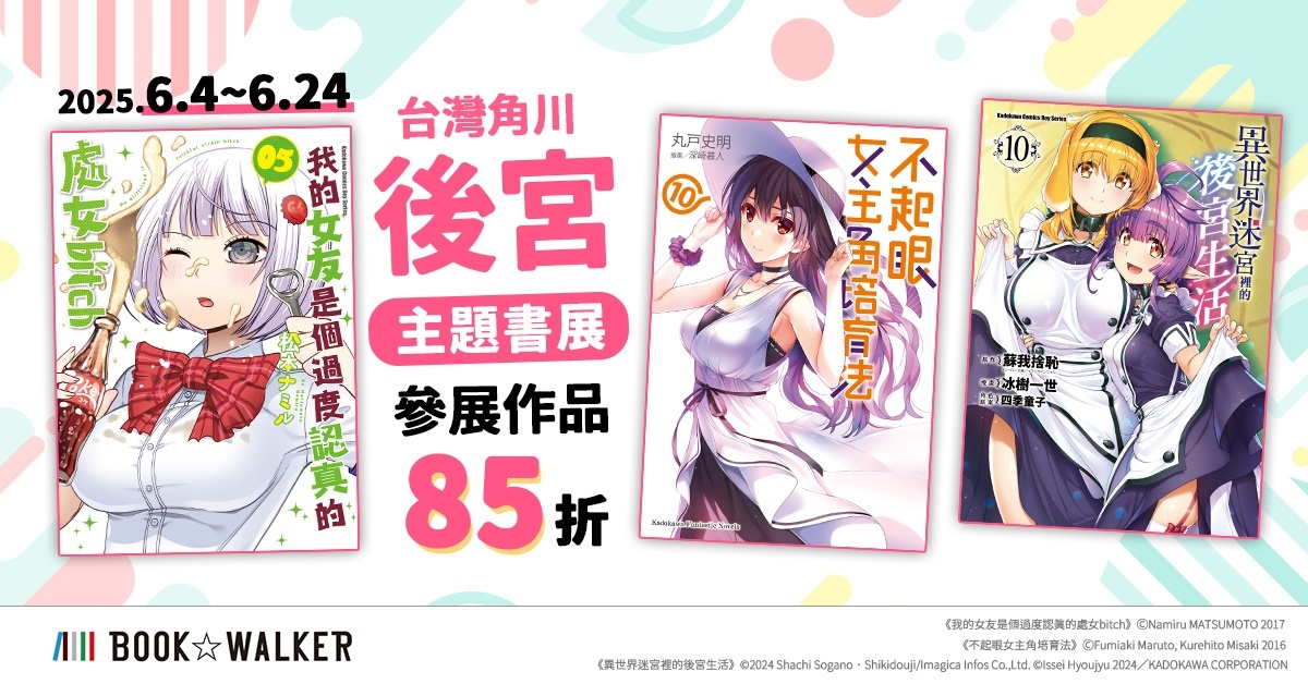 同一天準時亮相的還有「台灣角川後宮主題書展」!6 月 4 日至 6 月 24 日,參展作品享 85 折優惠!經典必看的《異世界迷宮裡的後宮生活》、熱烈打造遊戲的《不起眼女主角培育法》、眾多清純又激進角色的《我的女友是個過度認真的處女bitch》等。趁著活動期間充分體驗她們的獨到魅力吧!