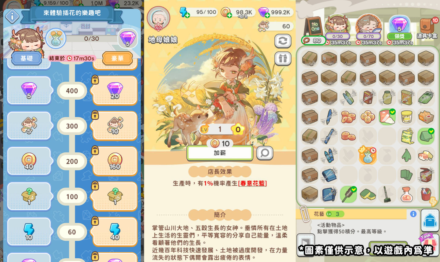 全新 PASS 活動「來體驗插花的樂趣吧」正式邀請各位玩家們與之一同走入花藝世界,活動期間為 2025/06/10 至 2025/06/23 23:59。活動期間開啟專屬 PASS 活動,進行合成就有機率獲得活動道具「花器Lv1」,最高可合併至「花器Lv3」,點擊後即可獲取積分,達指定積分可獲得階段獎勵,購買 PASS 禮包更可解鎖豪華獎勵,包括活動限定神明角色「地母娘娘」、「天庭藏寶閣」轉蛋專用的「家具代幣」等等。