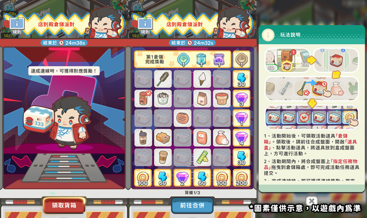 活動期間,玩家可透過活動入口領取任務道具「倉儲箱」,於合成盤面中將指定物品拖曳至倉儲箱完成提交。每完成一條連線即可獲得對應獎勵,完成整艙貨物更能解鎖下一個貨艙,快來挑戰連線極限,讓你的物流速度快到連三太子都要比個讚吧!