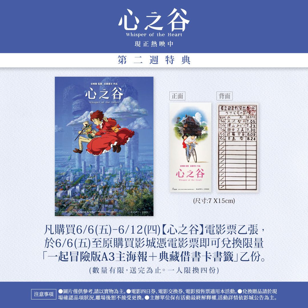 凡購買上映第 2 週(6/6~6/12)《心之谷》電影票乙張,於 6/6(五)起至原購票影城,即可兌換限量「一起冒險版 A3 主海報+典藏借書卡書籤」乙份,一人限換四張,數量有限,敬請把握收藏機會。