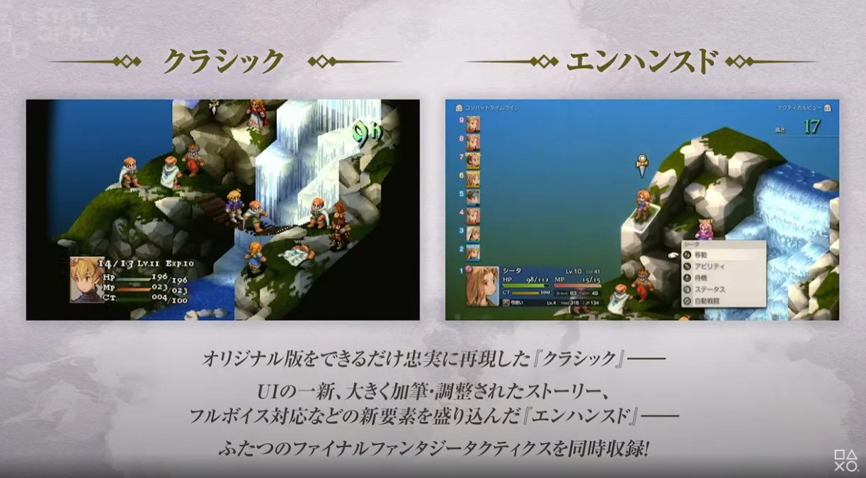 經典戰略角色扮演遊戲《Final Fantasy Tactics》(戰略版)將以《Final Fantasy Tactics – 伊瓦利斯編年史》於「State of Play」發表,將包含兩種不同版本供玩家選擇:「強化版」將帶來全程語音、最佳化使用者介面、畫面提升及新增的「見習戰士」簡易難度等現代化改進;「經典版」則保留 97 年原版樣貌與玩法,滿足新舊玩家體驗。