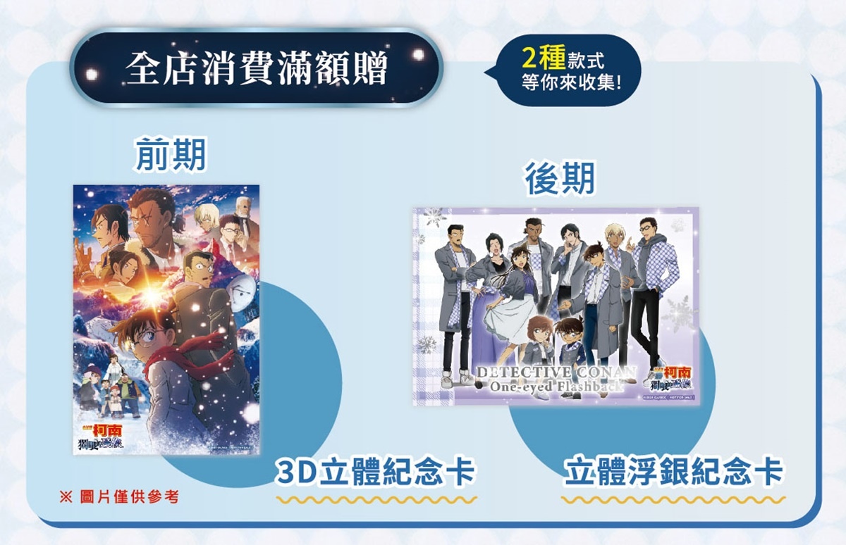 ★快閃店營運期間,首2週消費滿 2000 元(含),即加贈名偵探柯南A4紀念圖卡乙份。前後期全兩款!
