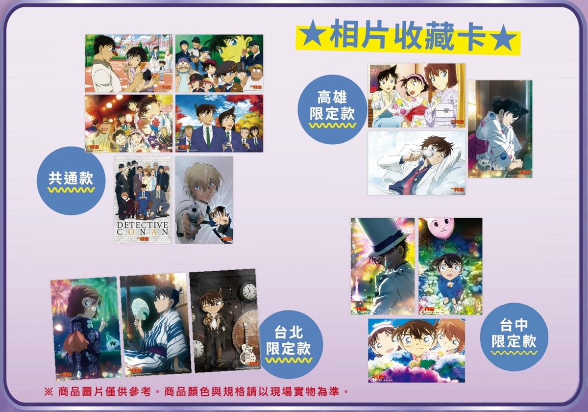 廣受粉絲喜愛的紀念小物全新再進化,精心打造台北、台中、高雄專屬圖樣的紀念收藏卡,全套 15 張集滿就是最強柯南粉!