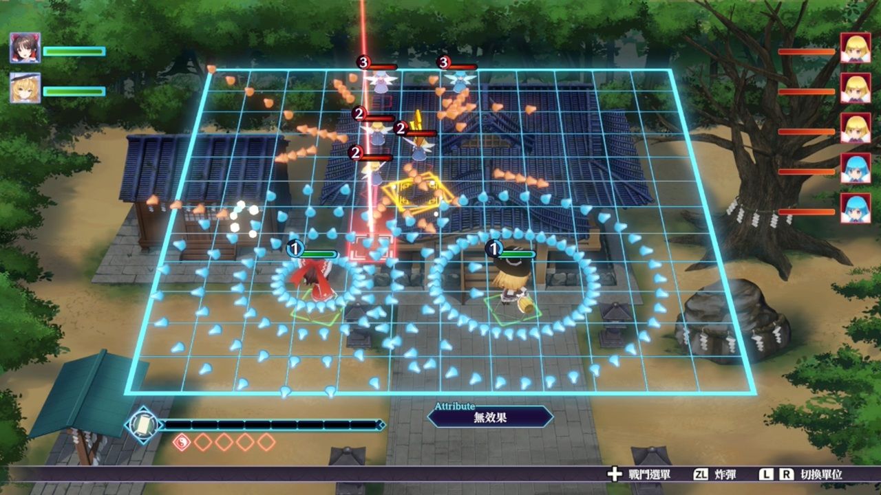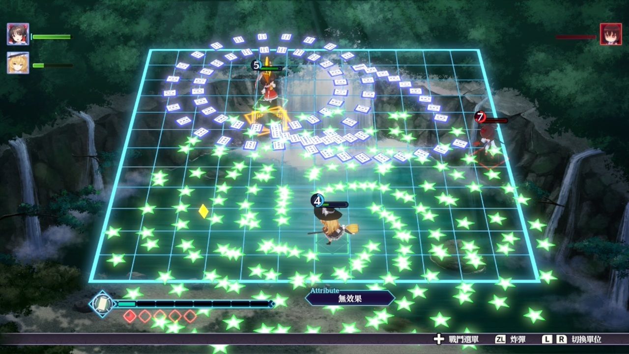 遊戲的戰鬥系統採用無等待時間的即時制,當角色的行動槽集滿後即可執行操作。玩家需消耗「行動點數」(AP)來製造彈幕進行攻擊,並透過累積能量來發動名為「必殺符卡」的強力攻擊。系統中也包含了「擦彈(Graze)」機制,成功閃避敵方彈幕能加速必殺技能量槽的累積。此外,玩家亦可使用「炸彈」來瞬間清除畫面上的敵方彈幕,成為影響戰局的關鍵操作之一。