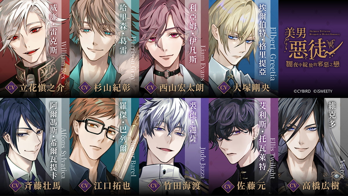 《美男惡徒》以「闇夜中的邪惡之戀」作為主題,特別邀請九位日本人氣實力派聲優參與,為九位風格迥異的「惡徒男主角」獻聲,打造沉浸式戀愛體驗,讓玩家彷彿身歷其境!