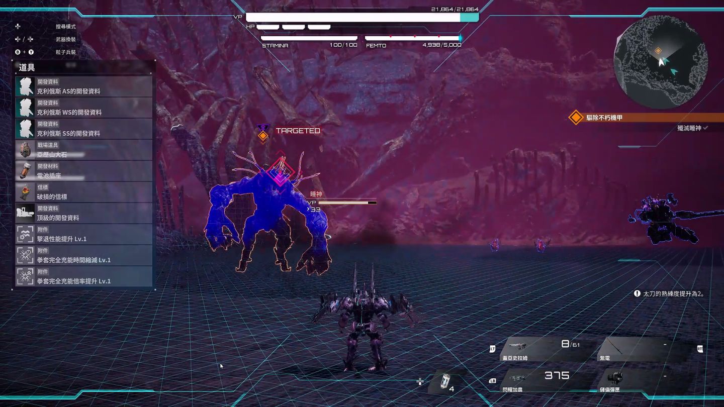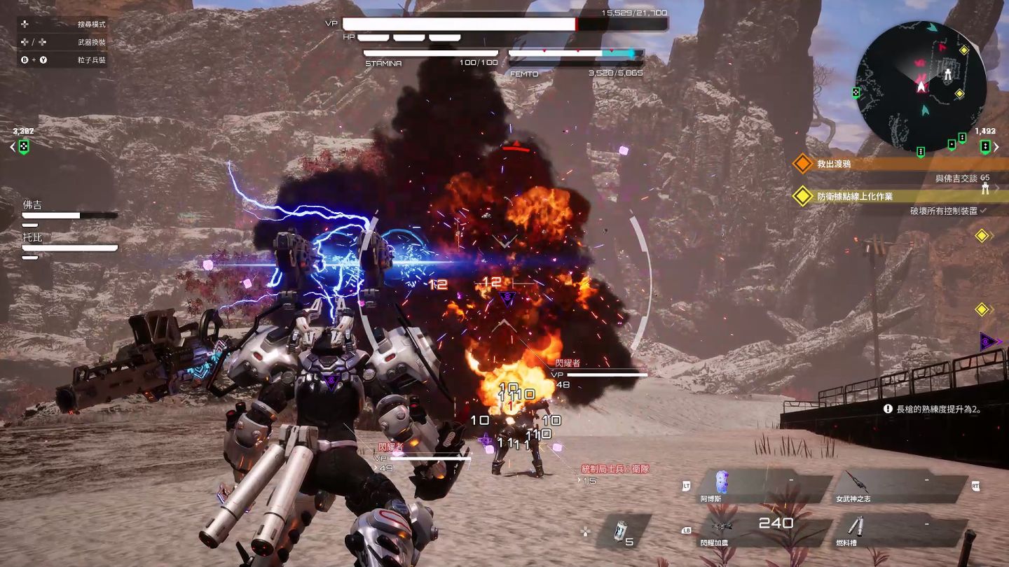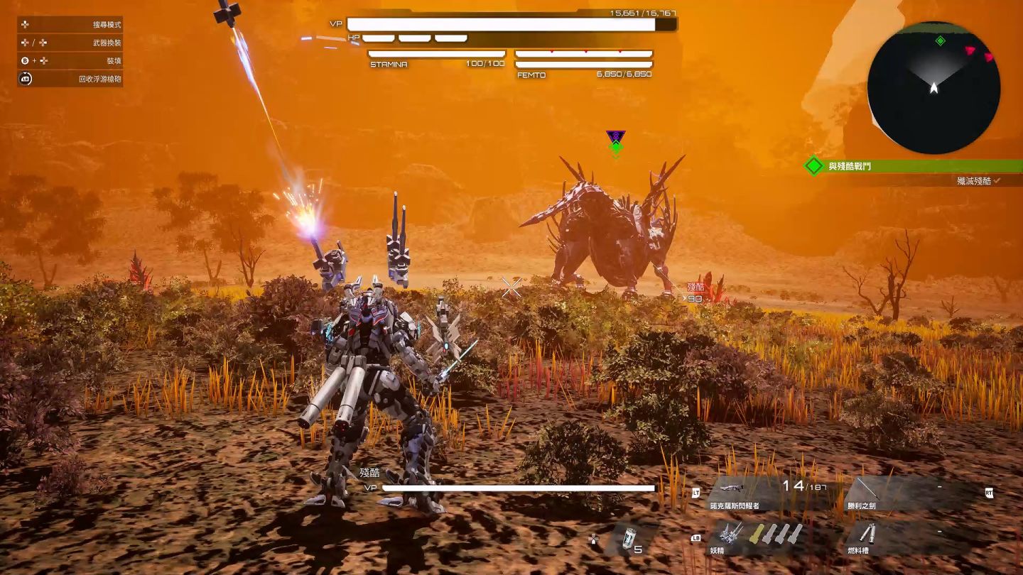 本次提供試玩內容包含設計機體和裝備、進行探索、完成任務。初步展現本作特色的機甲服設計、操作與戰術多樣性以及最大的特色在地面能在空中自由移動,並提供挑戰大型 Boss 的機會。