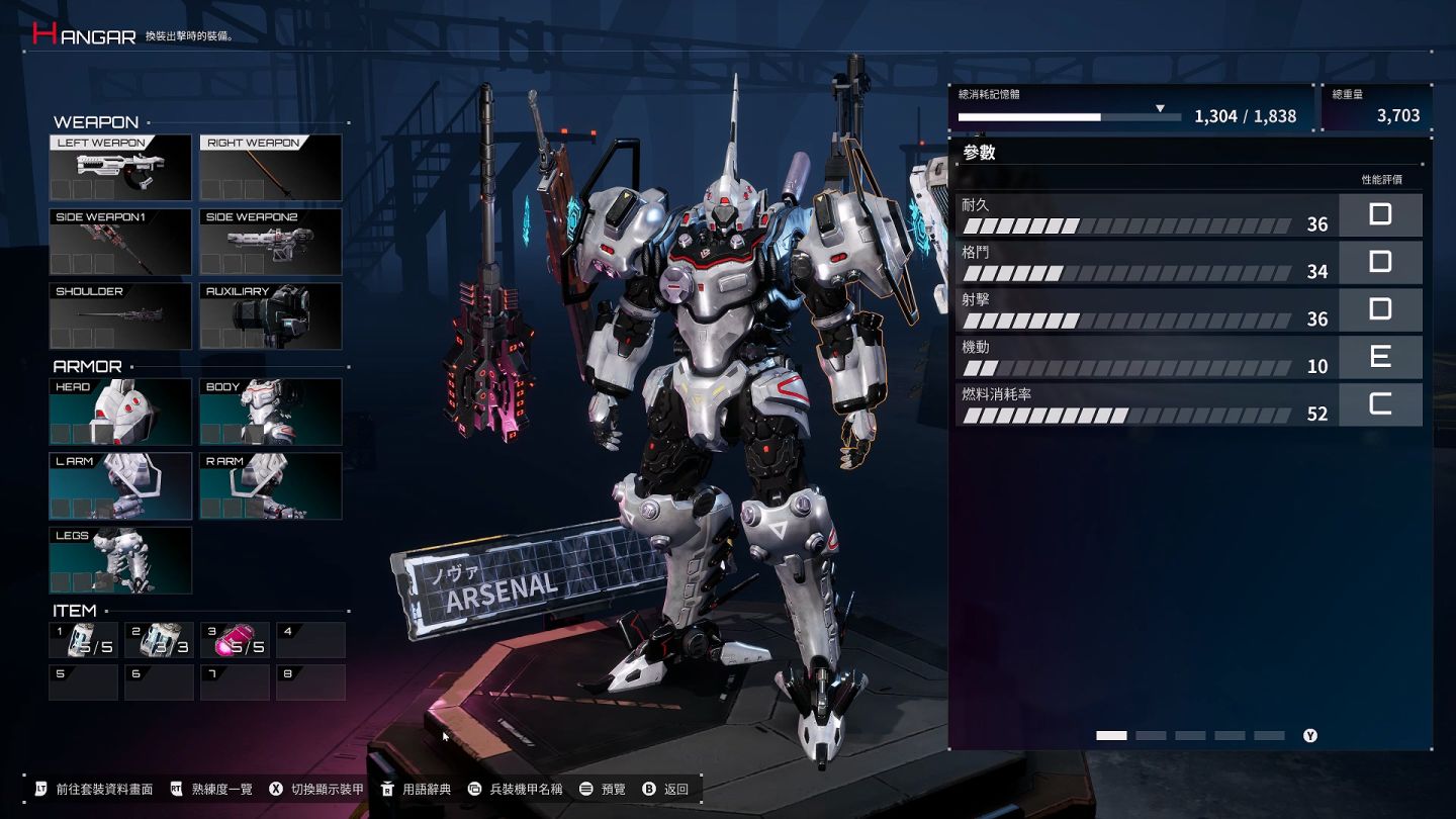 雖然一樣稱為「兵裝機甲」,但這次外型更接近「動力裝甲」,玩家的能力者角色不再是「搭乘」機甲,而是以類似「穿戴」或「變身」的方式與兵裝機甲合而為一。但是在 HANGAR 調整機甲的方式,與前作類似,分為頭、身、腿、手的裝甲部位。武器依然有左右手、備用左右武器及肩部、輔助武器等配置,依然需要按照 COST 也就是記憶體的方式來進行配裝,前作受好評的機甲著色系統依然存在。