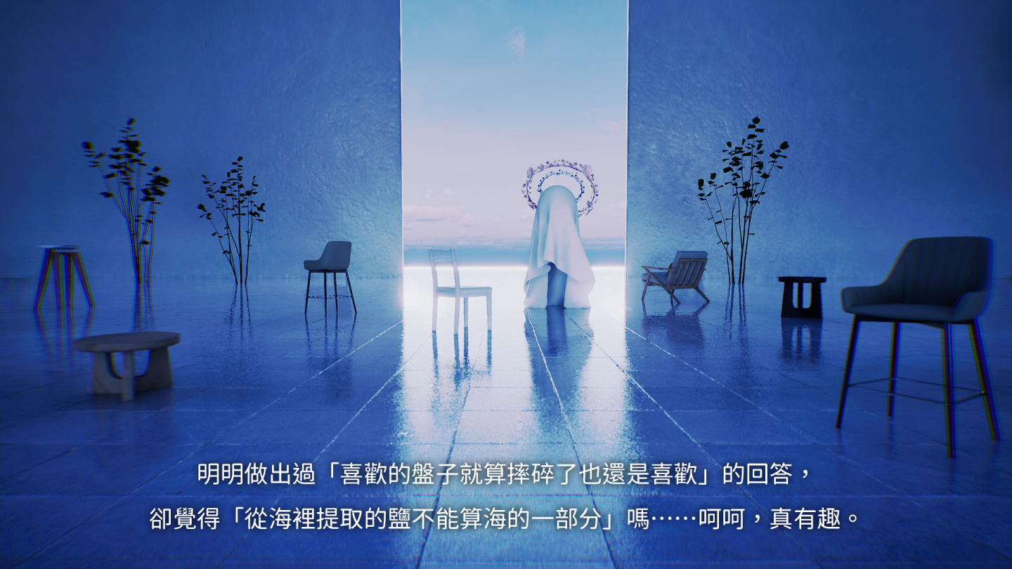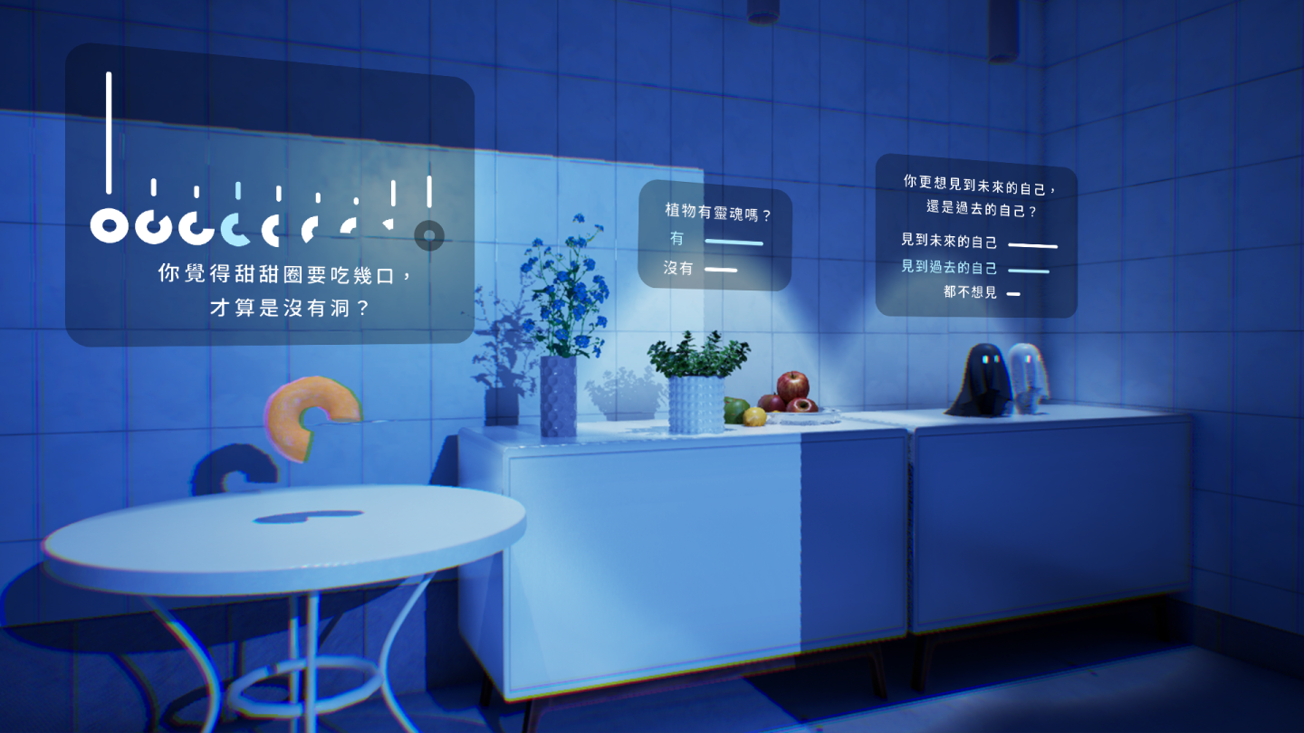 你將置身於一間靜謐、陽光灑落的房間,與神祕的角色「我」展開一連串問答。例如:「甜甜圈的中心叫做『洞』,如果吃掉一半,那個『洞』還存在嗎?」這些沒有標準答案的提問,會不斷挑戰你的直覺與思維,也許從中你將窺見自己的內心輪廓。