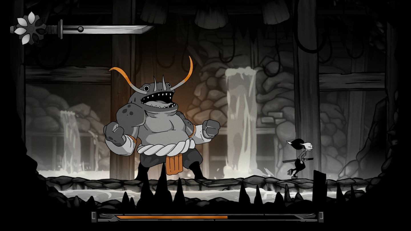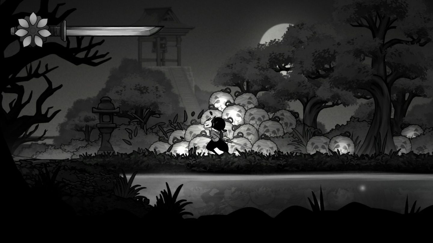 經典武士電影(劍戟片)以手繪動畫的方式呈現,每場戰鬥都有與神靈相稱的場景設計,能讓你體會到精巧的黑白藝術。在表達神靈之力時,針對其招式動作進行上色,確保畫面兼顧美感與功能。