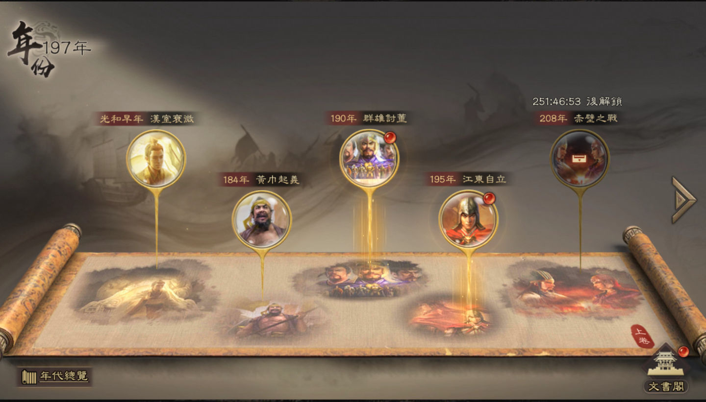劇本中特別採用「年份代系統」,將三國的興衰變遷細緻重現,帶領主公穿越多個重要年代節點,親身體驗從黃巾之亂到三分鼎立的歷史巨變。「亂世烽煙」不以特定戰役為主軸,而是讓每位玩家投身於完整的三國風雲史詩,真正的成為歷史的一環。