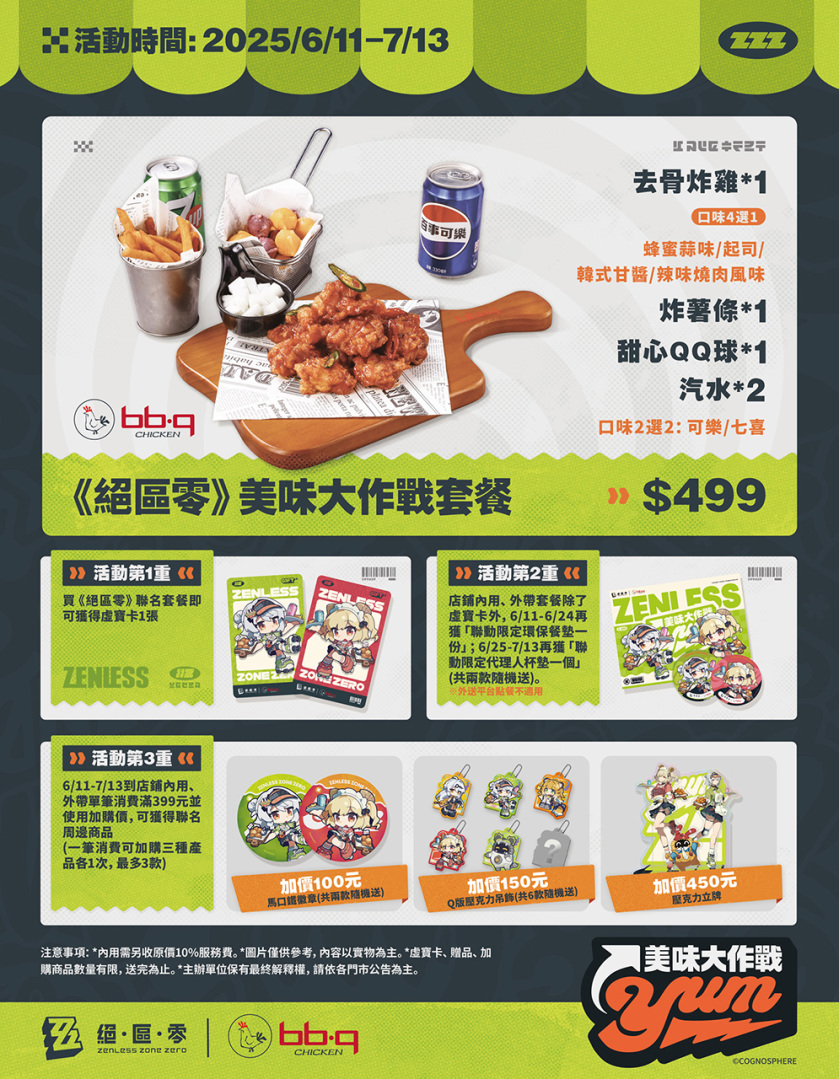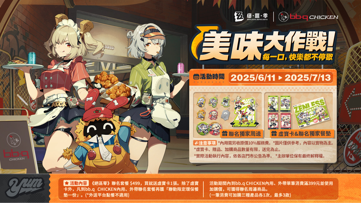 本次活動將自 6 月 11 日至 7 月 13 日於全台所有 bb.q CHICKEN 門市進行。同時,全台將有三間 bb.q CHICKEN 搖身一變為《絕區零》「美味大作戰」主題門市,讓繩匠在享用美味的炸雞同時,還能欣賞期間限定的《絕區零》主題佈景哦!