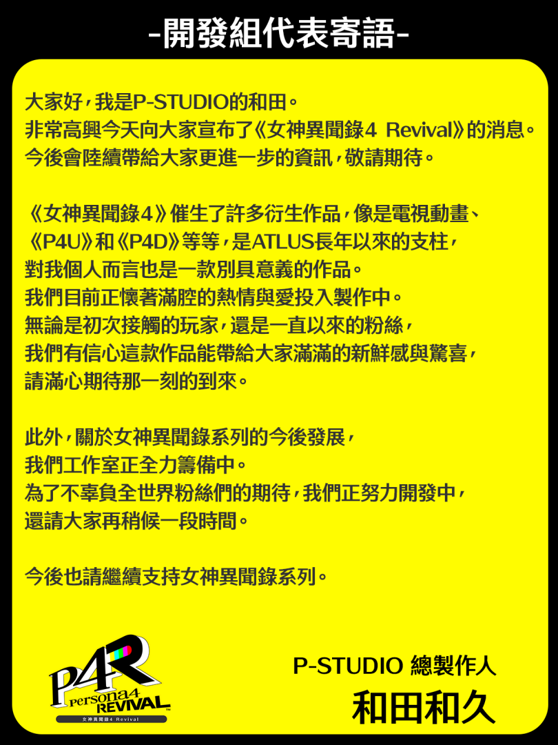 SEGA 世雅宣布,Atlus 超人氣 RPG《女神異聞錄》系列新作《女神異聞錄4 Revival》將在 Xbox Game Pass、Xbox Series X|S、Windows、PS5 以及 Steam 平台發售,遊戲支援繁體中文等語系。此外亦同步公開了前導預告片與前導網站,請務必前往觀看。