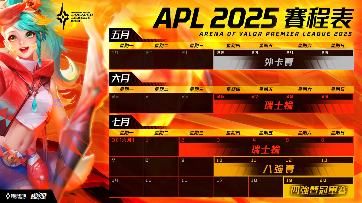 緊接著 APL 2025 超級職業聯賽將於 6/26 至 7/20 在泰國曼谷拉開序幕,GCS 賽區六隊全數贏得挑戰資格,即將迎戰來自 AOG 及 RPL 賽區的菁英隊伍,共同爭奪世界冠軍的寶座,詳細賽程請密切關注官方資訊。