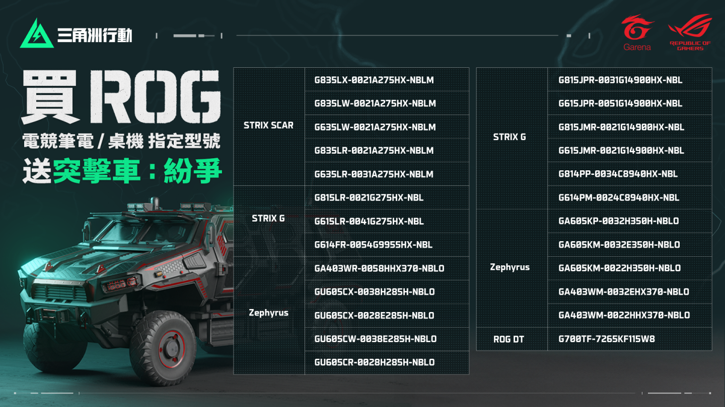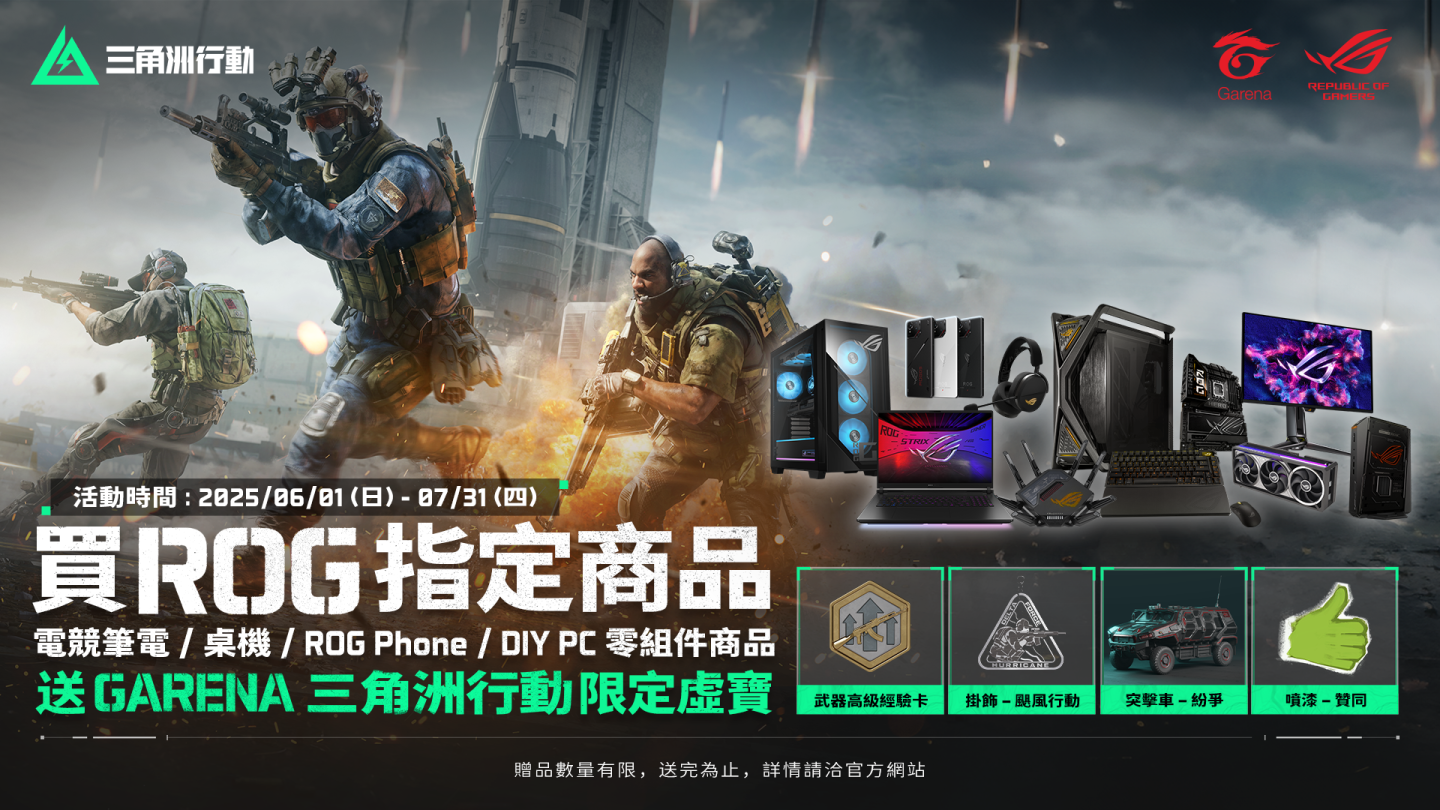 除賽事熱血展開外,《Garena 三角洲行動》更攜手 ROG 推出專屬聯名活動,至 7 月 31 日止,凡購買 ROG 指定商品,即可獲得《Garena 三角洲行動》限定虛寶序號乙組,其中包含永久載具和噴漆造型。無論是久經沙場的老將,或剛入戰區的新兵,現在就是升級裝備、展現實力的最佳時機。