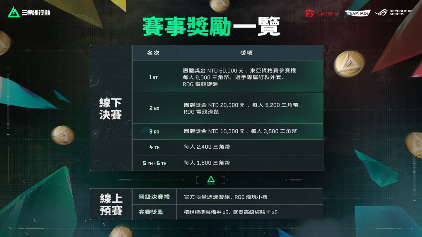 本次「賞金獵人賽」特別與華碩電競潮牌 ROG 攜手合作,從硬體支援至比賽體驗全面升級。總決賽將全程使用 ROG 頂規電競設備,強勢助攻參賽選手發揮個人無限潛能。優勝隊伍除獲得豐厚獎金外,更將獲頒 ROG 獨家好禮,歡迎各路好手踴躍報名參加!