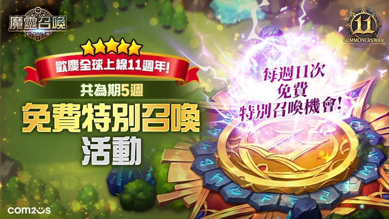《魔靈召喚》為慶祝全球上線 11 週年,活動期間內每週都可以免費召喚 11 次,包含 10 次水/火/風屬性召喚及 1 次光/暗屬性召喚!除此之外,召喚前還能挑選 5 隻 5 星魔靈和 5 隻 4 星魔靈進行召喚機率大提升,想要一舉召喚夢想魔靈的玩家千萬不能錯過!