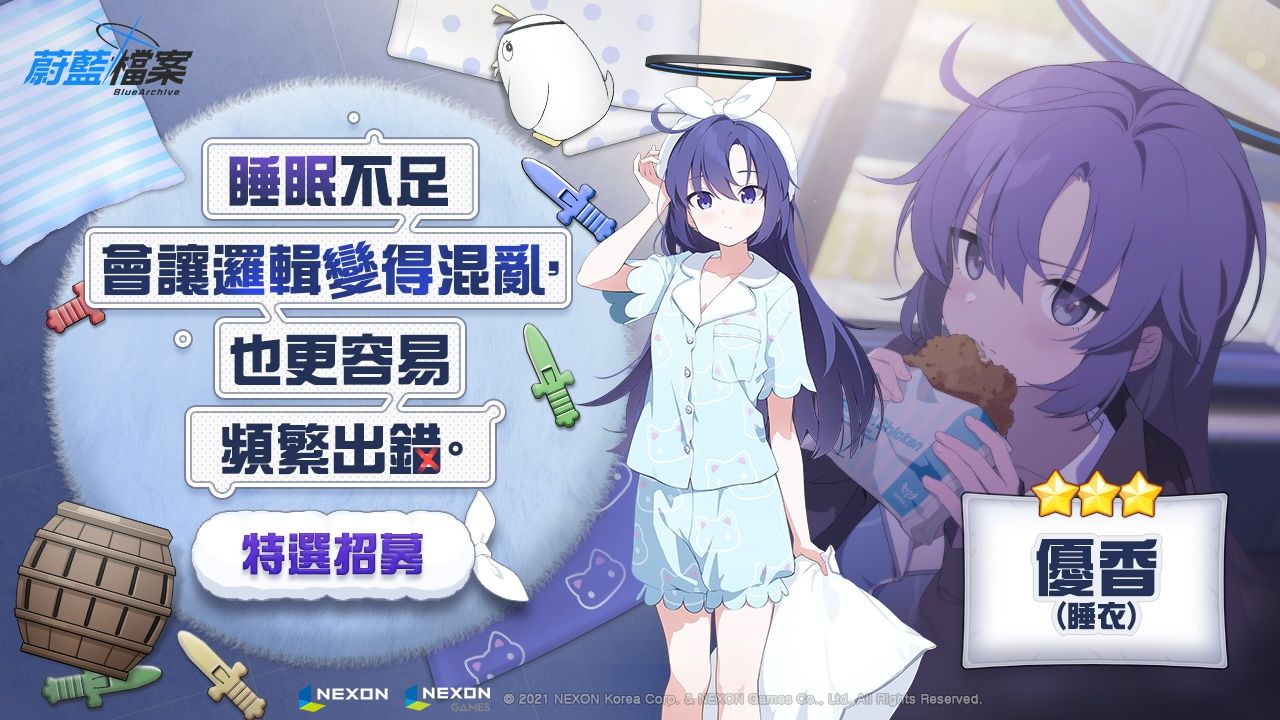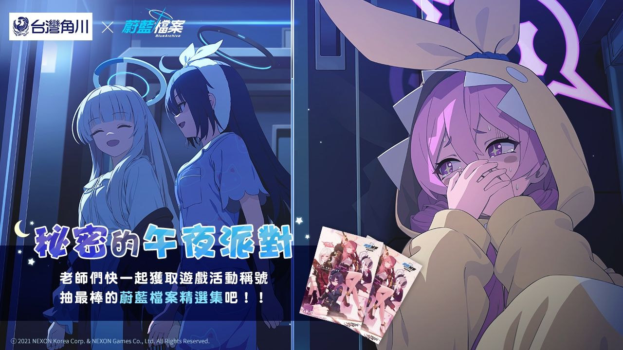 《蔚藍檔案》於 6 月 10 日更新睡衣主題的新角色以及全新活動劇情「祕密的午夜派對~鐘響時刻的捉迷藏~」。在本次活動劇情中,可以觀賞到「優香」與「乃愛」等「千年科學學園」的可愛學生們,在共享年末派對前所經歷的故事。