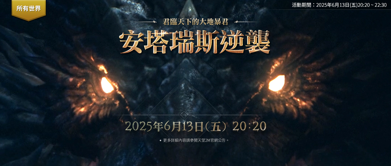 所有世界共同活動「安塔瑞斯逆襲」也將在本周五登場。原始世界 65 級以上、保值世界 60 級以上玩家,6/13(五)20:20~22:30 可由「選單→副本→普通副本→安塔瑞斯巢穴(活動)」入場,並於 20:30 開始討伐。