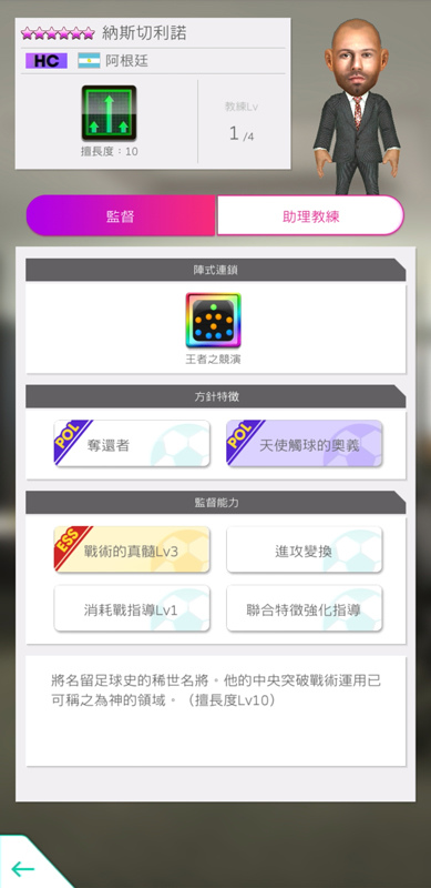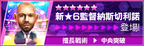 持有編組特定球員即可得到增強的陣式連鎖「王者之競演」、持有戰術擅長度 Lv10 的新★6 監督「納斯切利諾」登場!可於活動期間中的特別任務「進行 10 場球賽」中獲得。