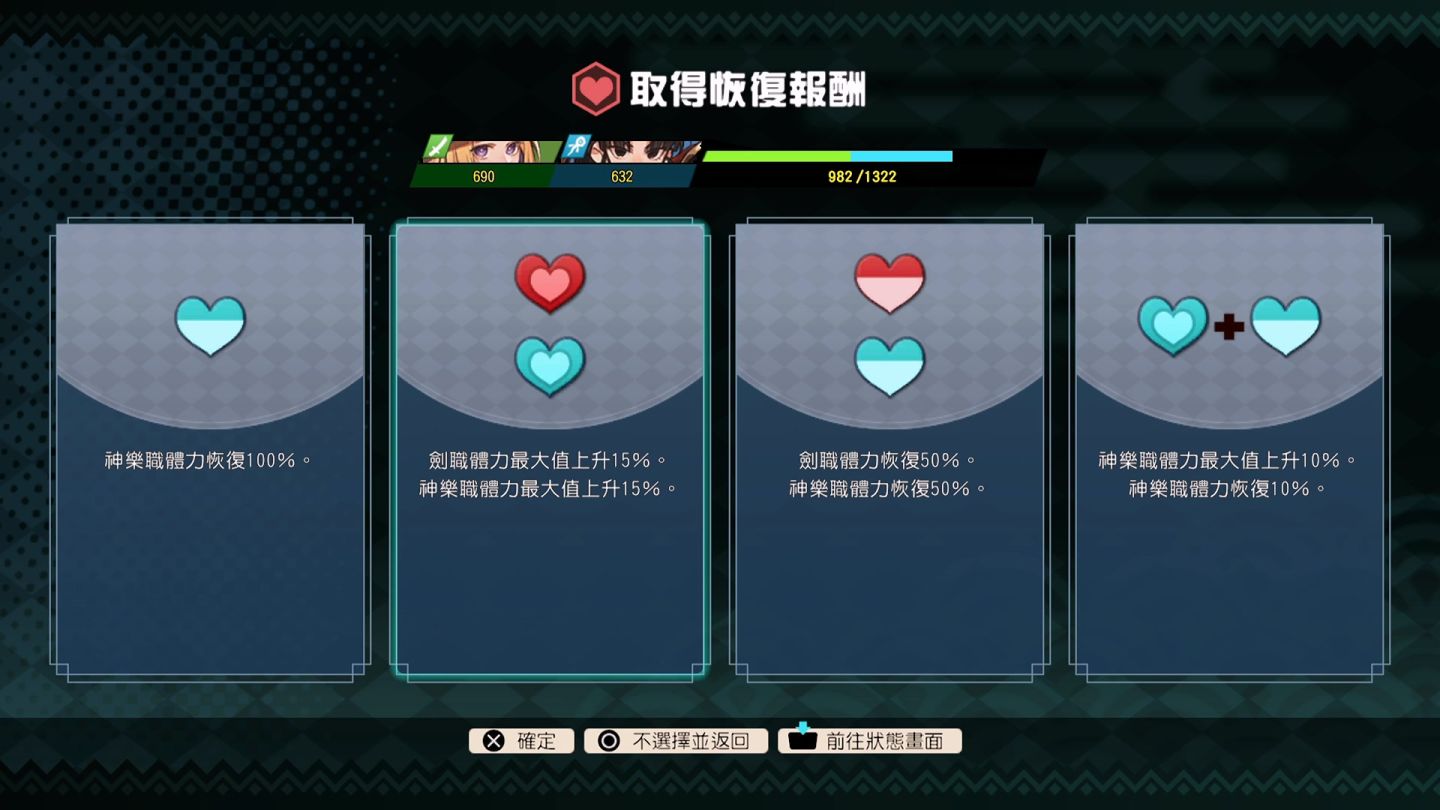 採用半共有 HP 的形式,因為劍跟神樂會共用 HP,所以一直到雙方 HP 都歸零為止是不會結束,因此玩家可針對讓其中一方的 HP上限大量降低,卻可以讓另一方被明顯強化,等等高風險高回報的設定等方式,打造出了本作獨有的樂趣。