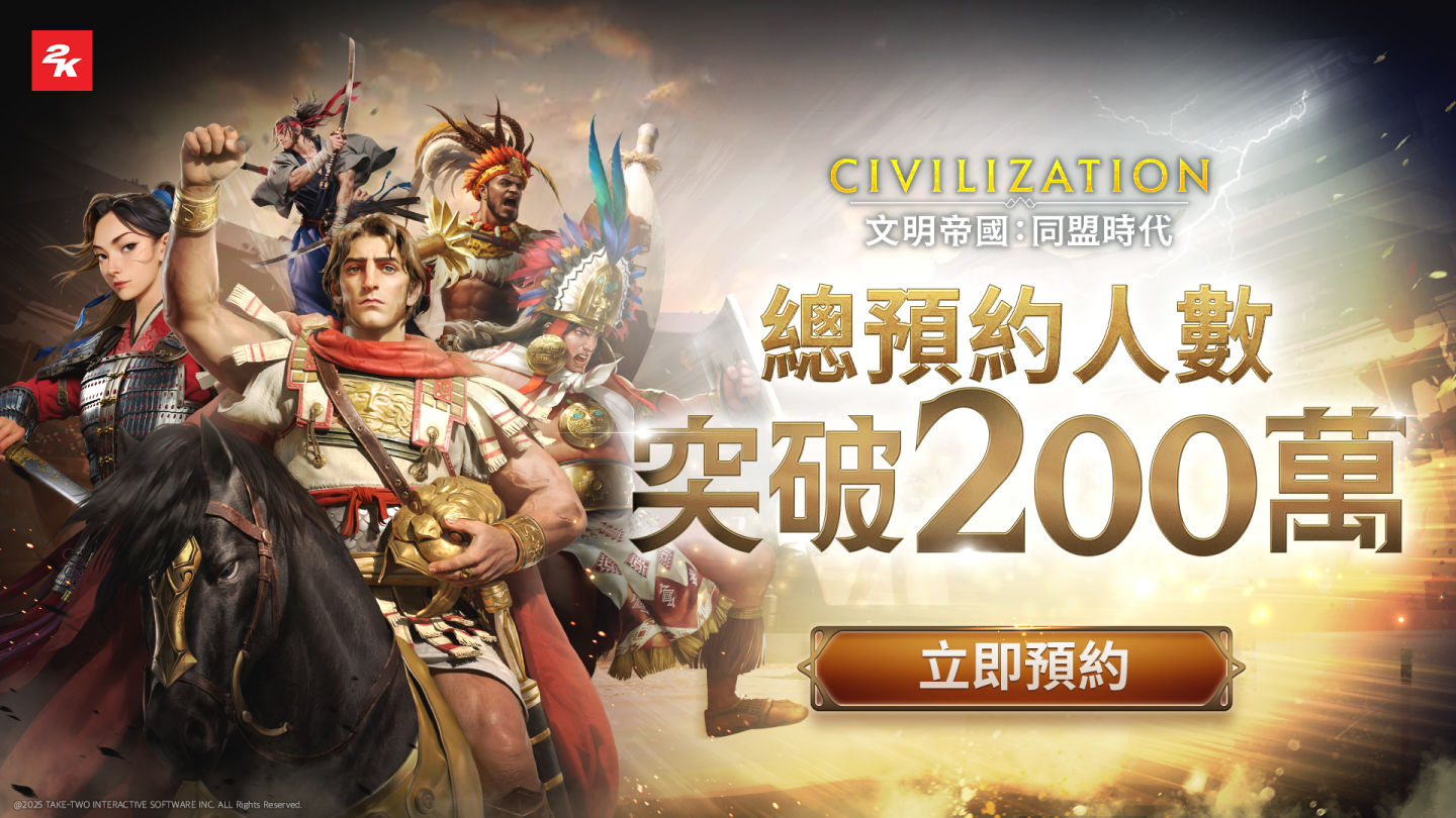 《文明帝國:同盟時代》自開放預約以來話題不斷,人氣持續攀升,官方今宣布事前登錄人數正式突破 200 萬人,所有預約里程碑獎勵也已全數達成。開服當日玩家將可領取包含限定頭像框、大量養成資源、文明贊助券等多項實用獎勵,為帝國發展打下堅實基礎。