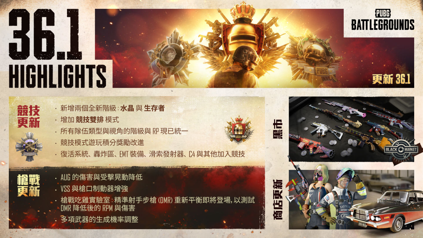 Krafton 旗下工作室 PUBG Studios《絕地求生》(PUBG:BATTLEGROUNDS)於日前(6/11)套用更新項目——版本 36.1 於正式伺服器。
