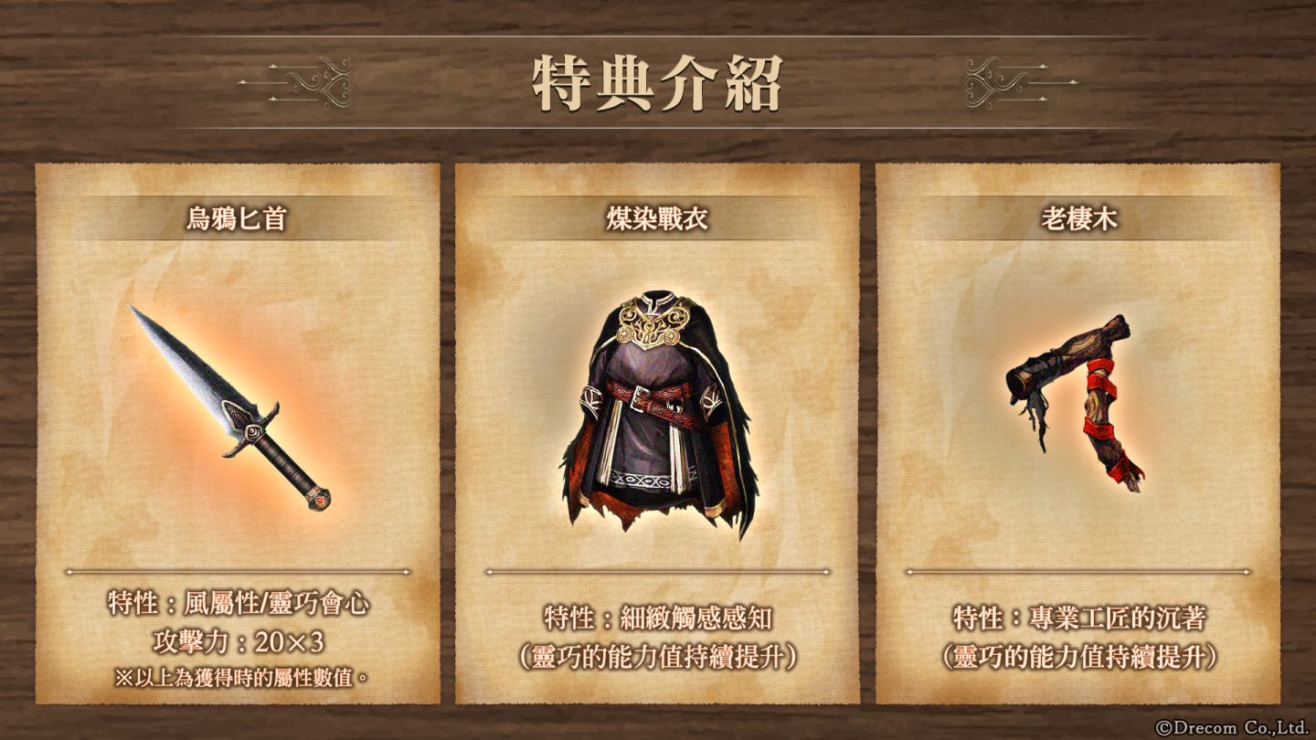 ①烏鴉匕首 特性:風屬性/靈巧會心攻擊力:20×3 ※以上為獲得時的屬性數值。 ②煤染戰衣 特性:細緻觸感感知(靈巧的能力值持續提升) ③老棲木 特性:專業工匠的沉著(靈巧的能力值持續提升) |