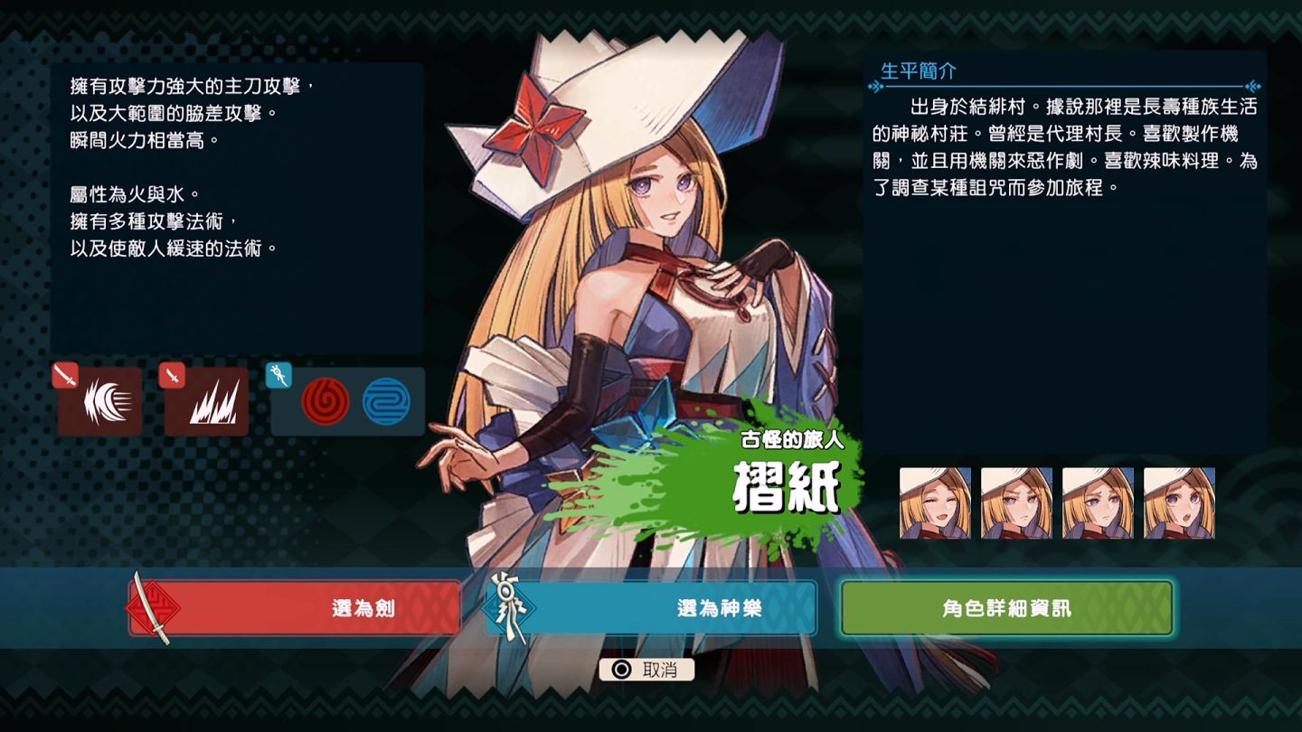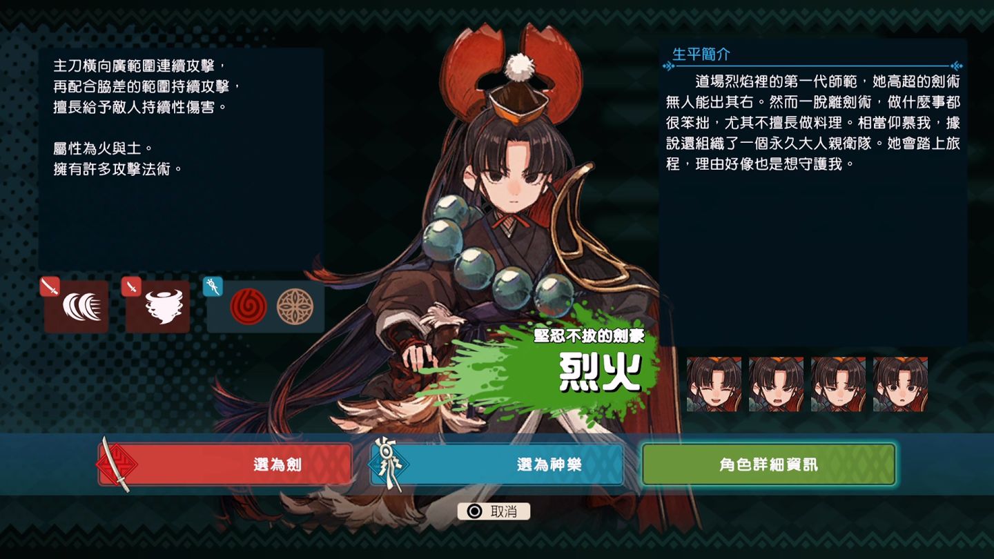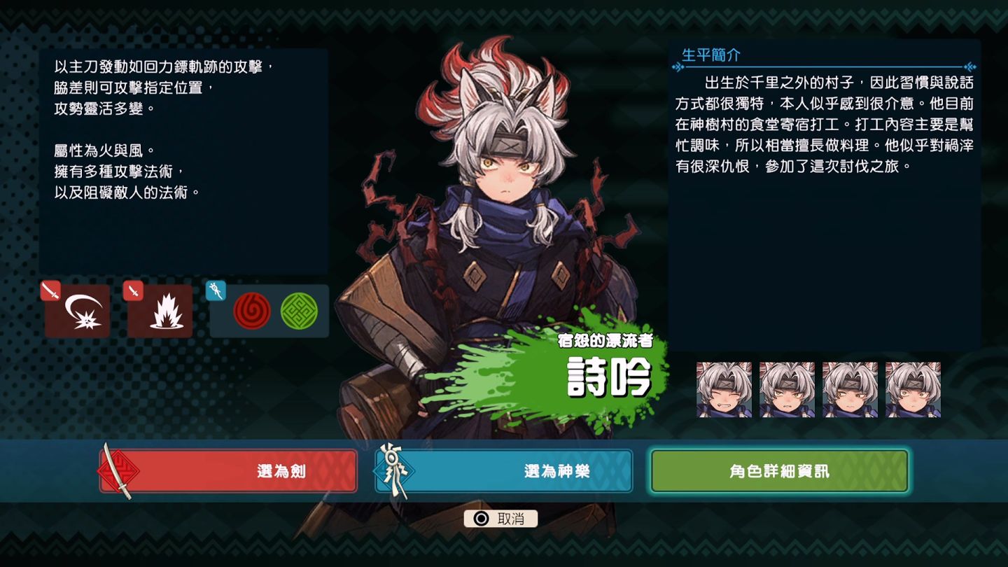 提供的四種角色有烈火、摺紙、錦、詩吟四位,各自有不同的傷害屬性與攻擊動作。