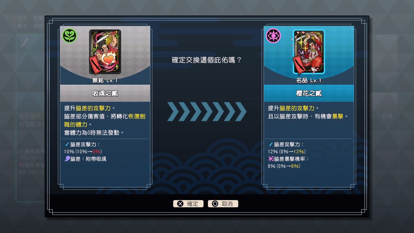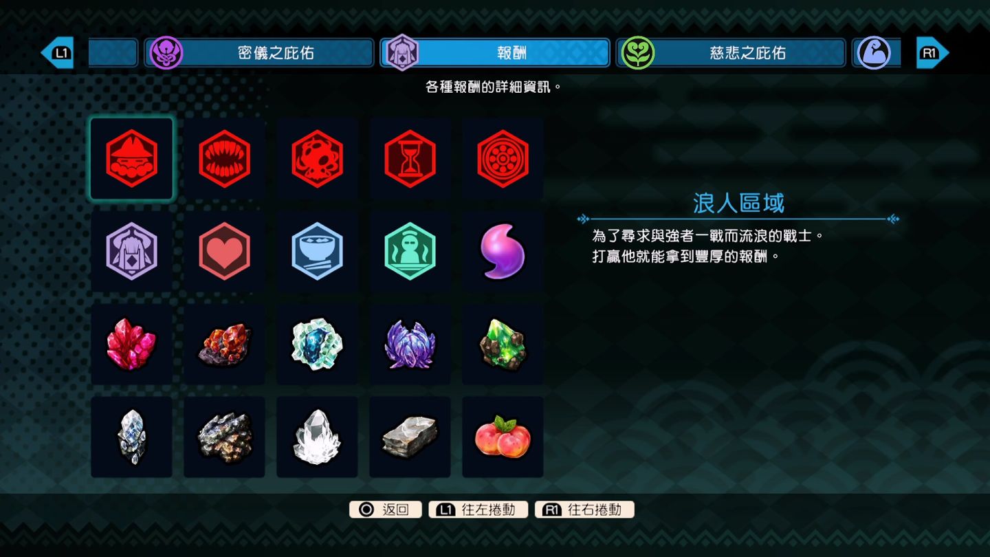區域隨著玩家選擇的種類,得到獎勵也不同,因此通關區域後,會隨機出現能強化能力的「庇佑」讓玩家選擇,庇佑能改變的變數相當多變,從基礎的提升數值、到動作影響的變數,甚至是能夠衝刺後回覆刀的耐久度的庇佑都存在,但是能帶的庇佑有限,且隨機出現。