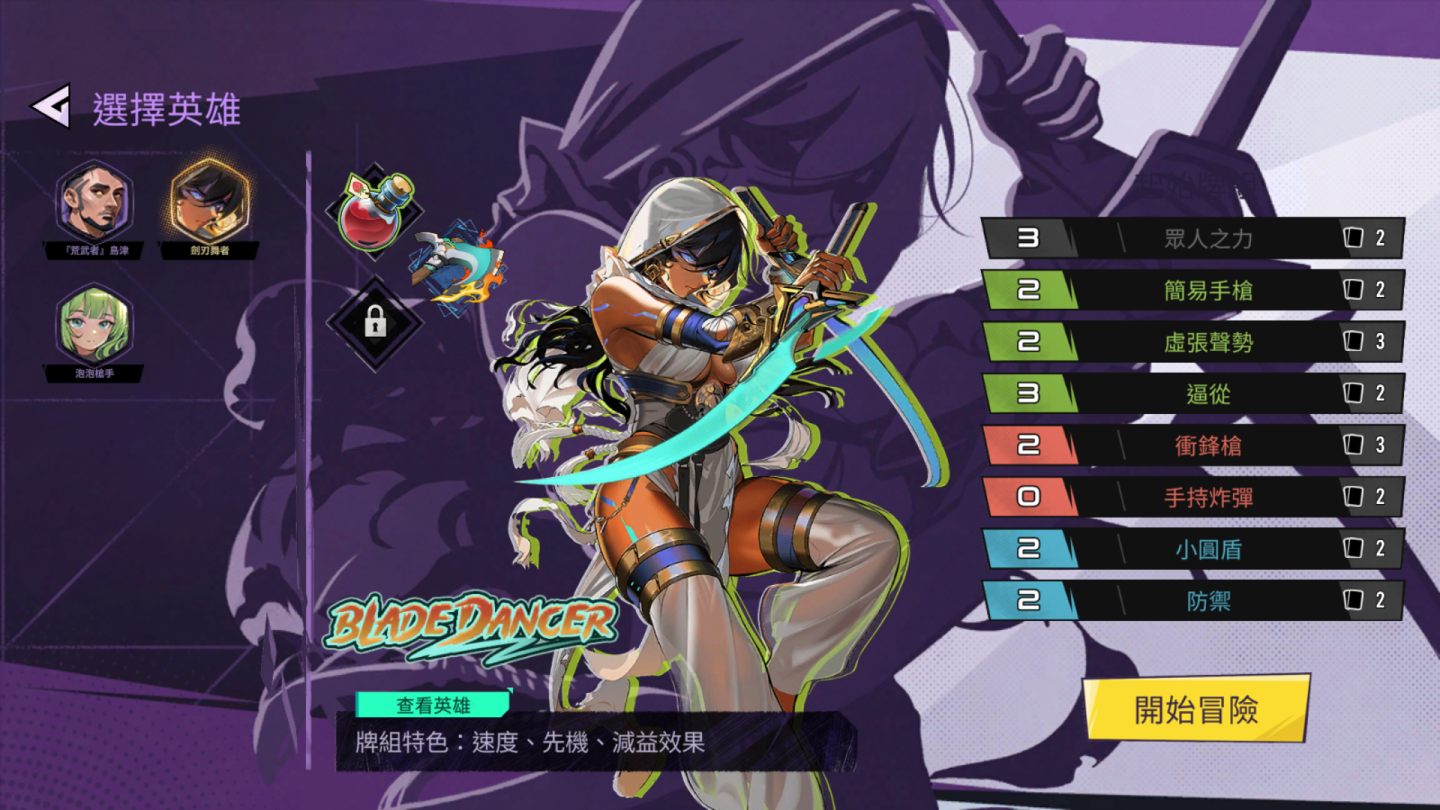 在本次釋出的試玩版中,提供了三位擁有不同戰鬥風格的英雄供玩家選擇,分別是注重力量攻擊的「荒武者」島津、以防禦反擊為核心的「泡泡槍手」,以及專精速度連擊的「劍刃舞者」。每位英雄都具備各自的初始卡牌、神器與資源,對應三種不同的戰鬥流派。