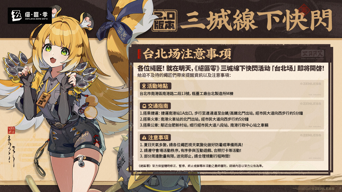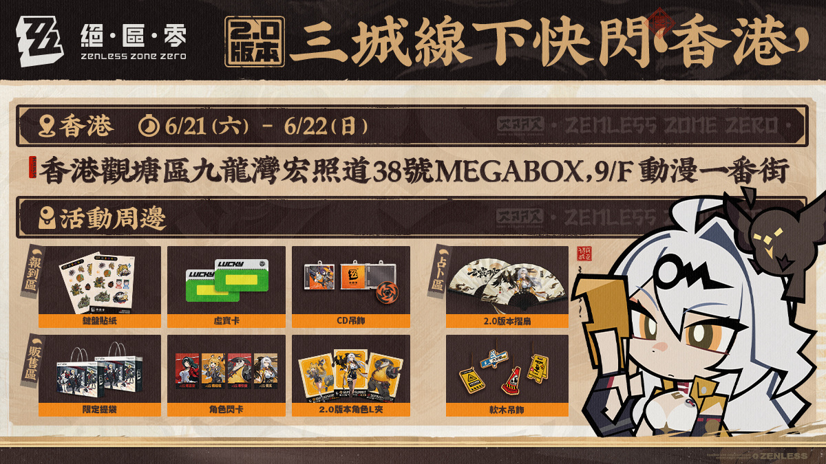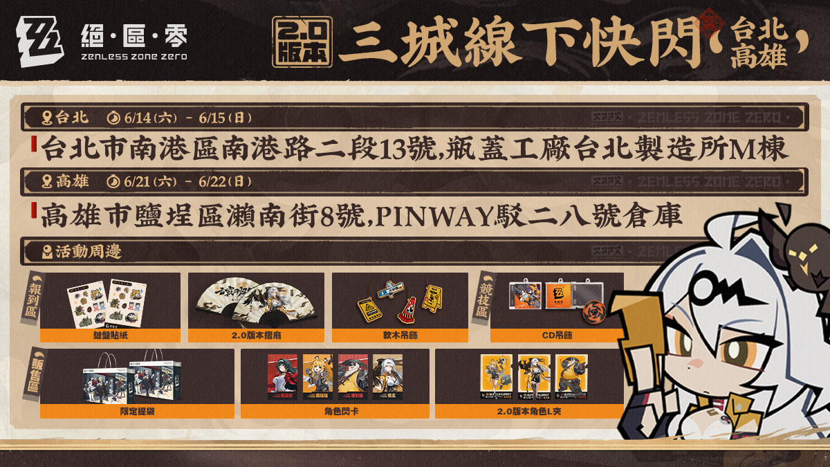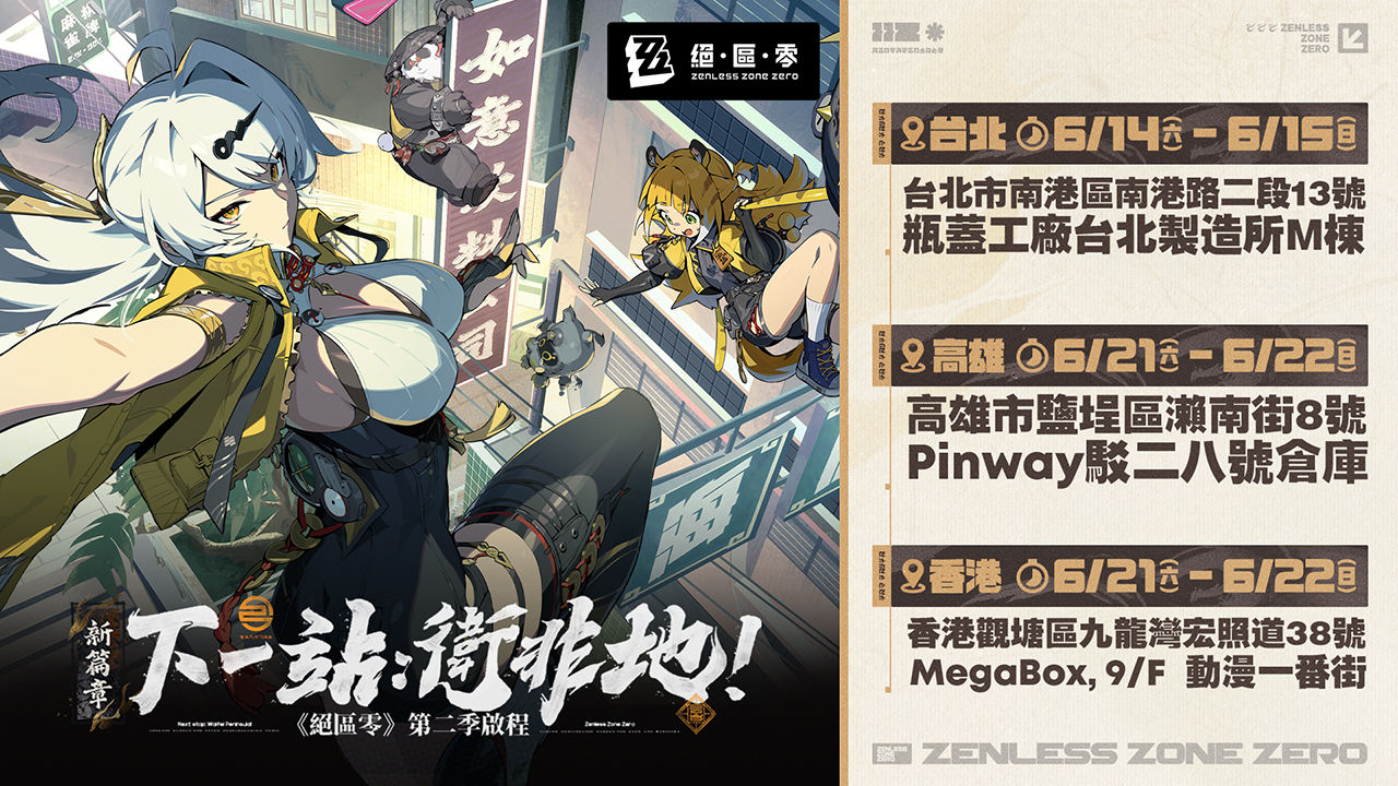 3D 動作角色扮演遊戲《絕區零》宣布,為慶祝全新 2.0 版本「雲霞同歸處」正式上線,將於 6 月 14 日起陸續在台北、高雄、香港舉辦「三城線下快閃活動」。