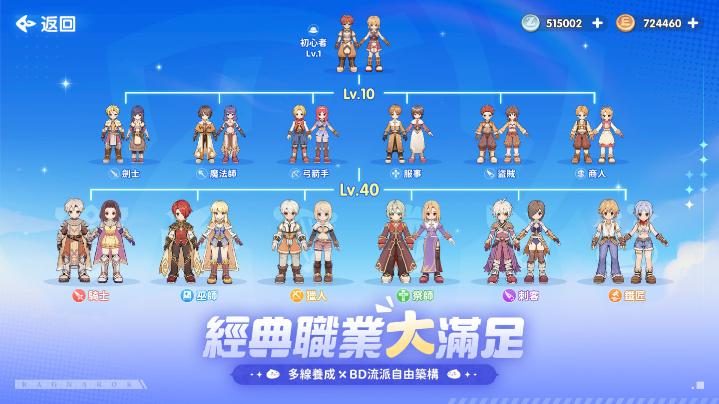 《RO 仙境傳說:世界》忠實還原經典的職業轉職系統,劍士、魔法師、服事、弓箭手、盜賊、商人閃亮登場,玩家可自由構築多元流派,成就屬於你的傳奇!官方重點強化了前期的攻速爽感,完美還原 AD 獵、BBC 刺客、敏劍等流派,保障攻速流玩家享受到極致的戰鬥體驗。