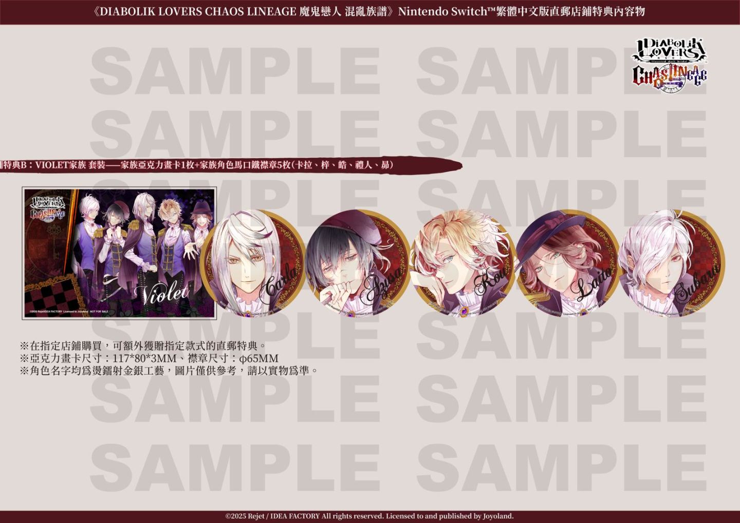 .限定特典⑧ VIOLET 家族套裝——家族亞克力畫卡×1+家族角色圓形馬口鐵襟章×5(卡拉、梓、皓、禮人、昴)