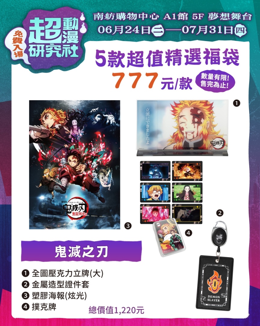 凡於超動漫研究社消費,並且於結帳時喊出指定口號「燃燒心靈,絕對要打倒無慘」,即可獲得《劇場版「鬼滅之刃」無限列車篇》與《劇場版「鬼滅之刃」無限城篇》早場優惠券各一張,兩款數量均有限,贈完為止。