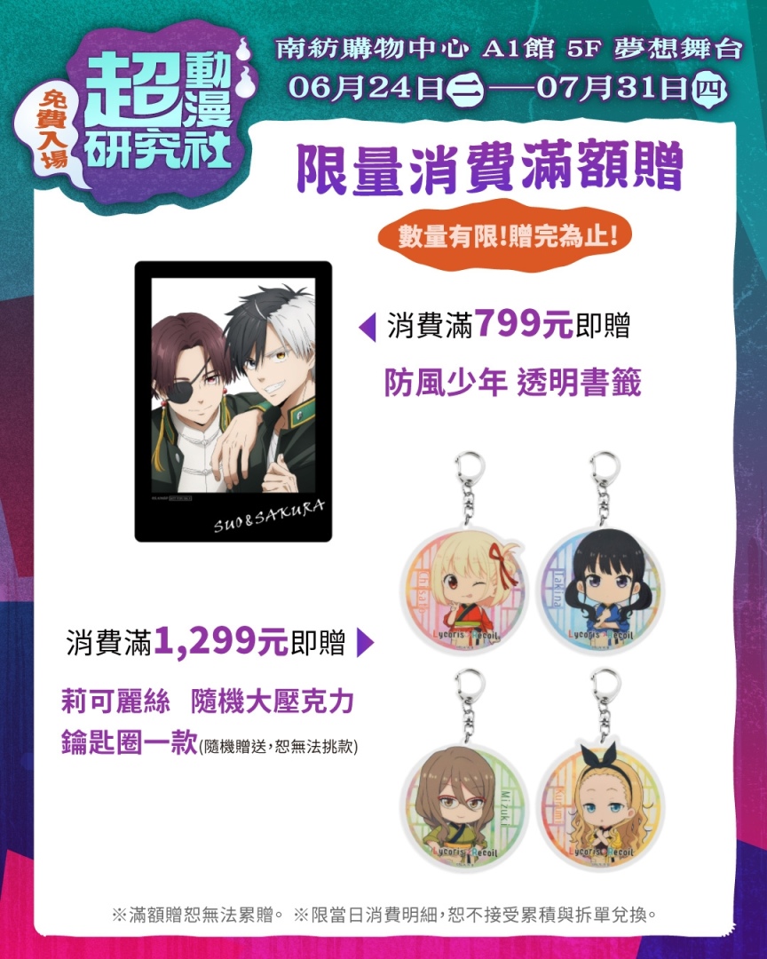 凡持當日於木棉花超動漫研究社購買之消費明細,達到指定消費金額即可兌換限量滿額贈好禮一款。滿額贈共兩種可做挑選,799 元滿額贈為《WIND BREAKER—防風少年—》櫻跟蘇枋精美大透卡、1,299 元滿額贈為《Lycoris Recoil 莉可麗絲》大壓克力吊飾(共四款隨機贈送,恕不提供挑選)。贈品皆不累贈,數量有限送完為止。